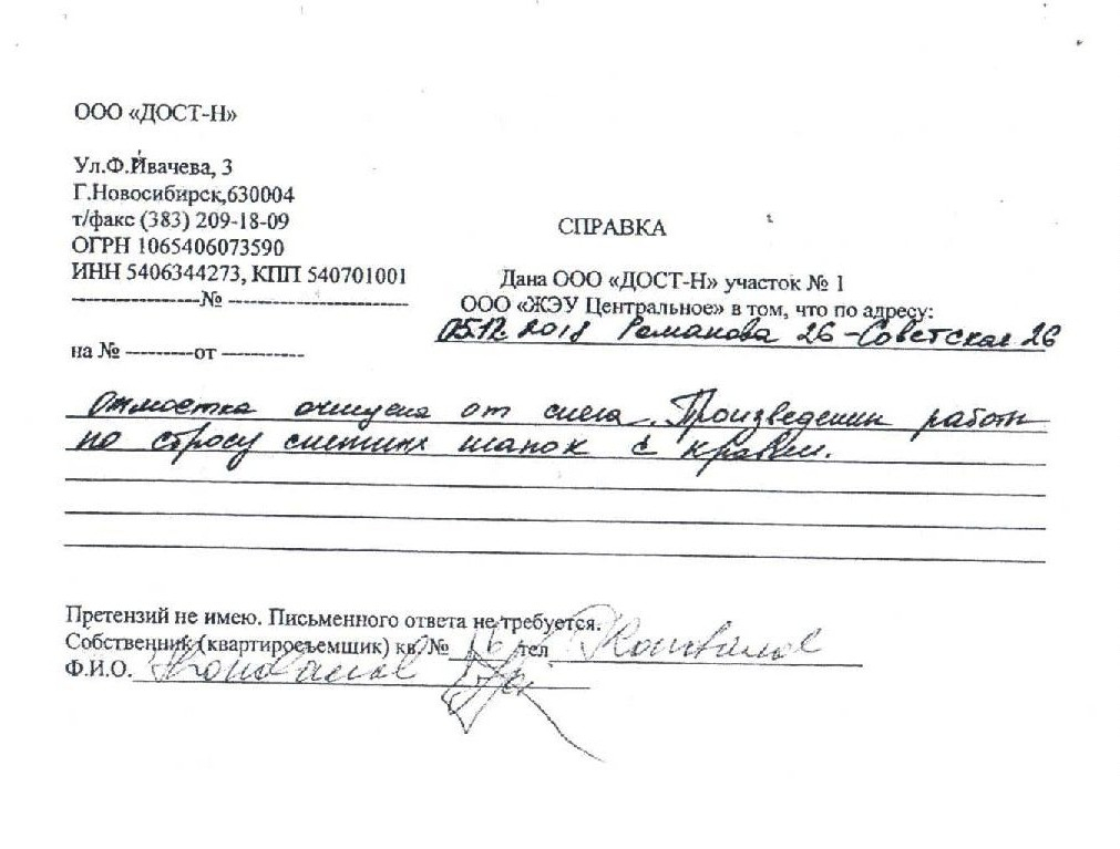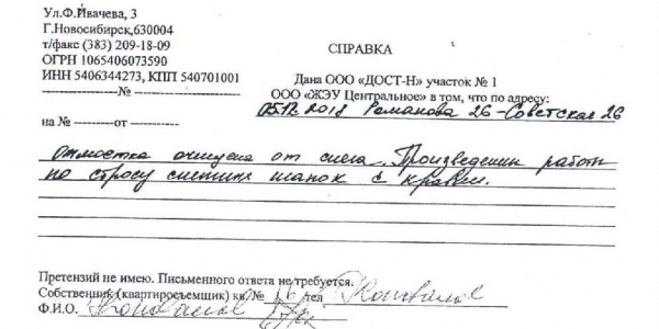Номер жалобы:46538 Тип жалобы:Иные проблемы ЖКХ Название объекта: Регион:Новосибирская область Город:Новосибирск Адрес:Советская 26 Описание жалобы:Снег на крыше дома Статус: