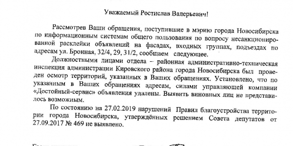 Номер жалобы:50073 Тип жалобы:Прочее Название объекта: Регион:Новосибирская область Город:Новосибирск Адрес:Бронная улица, 32/1 Описание жалобы:Объявления на фасаде дома Статус: