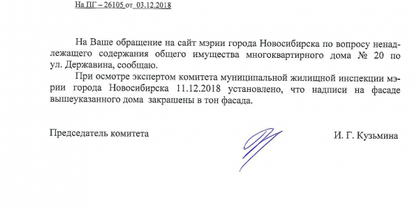 Номер жалобы:46482 Тип жалобы:Иные проблемы ЖКХ Название объекта: Регион:Новосибирская область Город:Новосибирск Адрес:Новосибирск, улица Державина, 20 Описание жалобы:Надписи на фасаде дома Статус: