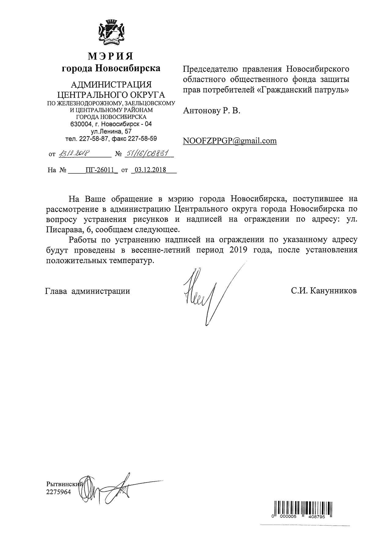 Номер жалобы:46338 Тип жалобы:Иные проблемы ЖКХ Название объекта: Регион:Новосибирская область Город:Новосибирск Адрес:улица Писарева, 6 Описание жалобы:Надписи на заборе Статус: