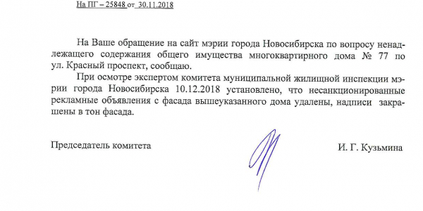 Номер жалобы:46345 Тип жалобы:Иные проблемы ЖКХ Название объекта: Регион:Новосибирская область Город:Новосибирск Адрес:Новосибирск, Красный проспект, 77 Описание жалобы:Объявления на фасаде дома Статус:
