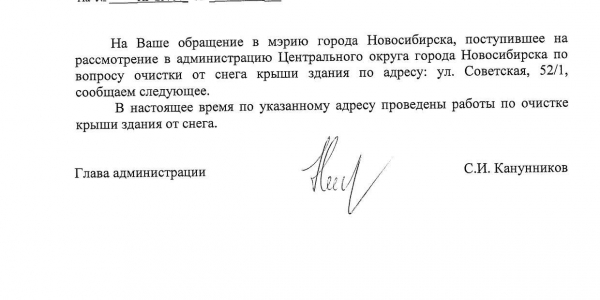 Номер жалобы:46290 Тип жалобы:Иные проблемы ЖКХ Название объекта: Регион:Новосибирская область Город:Новосибирск Адрес:Новосибирск, Советская улица, 52/1 Описание жалобы:Советская 52 к 1, снег и сосульки на крыше дома Статус: