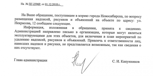 Номер жалобы:46297 Тип жалобы:Иные проблемы ЖКХ Название объекта: Регион:Новосибирская область Город:Новосибирск Адрес:улица Некрасова, 4 Описание жалобы:Надписи на фасаде дома Статус: