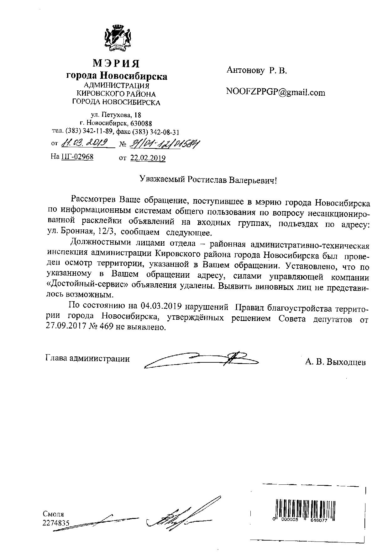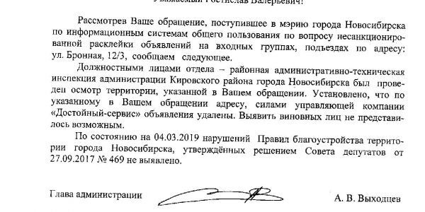 Номер жалобы:49962 Тип жалобы:Прочее Название объекта: Регион:Новосибирская область Город:Новосибирск Адрес:Бронная улица, 12/3 Описание жалобы:Объявления в неположенных местах Статус: