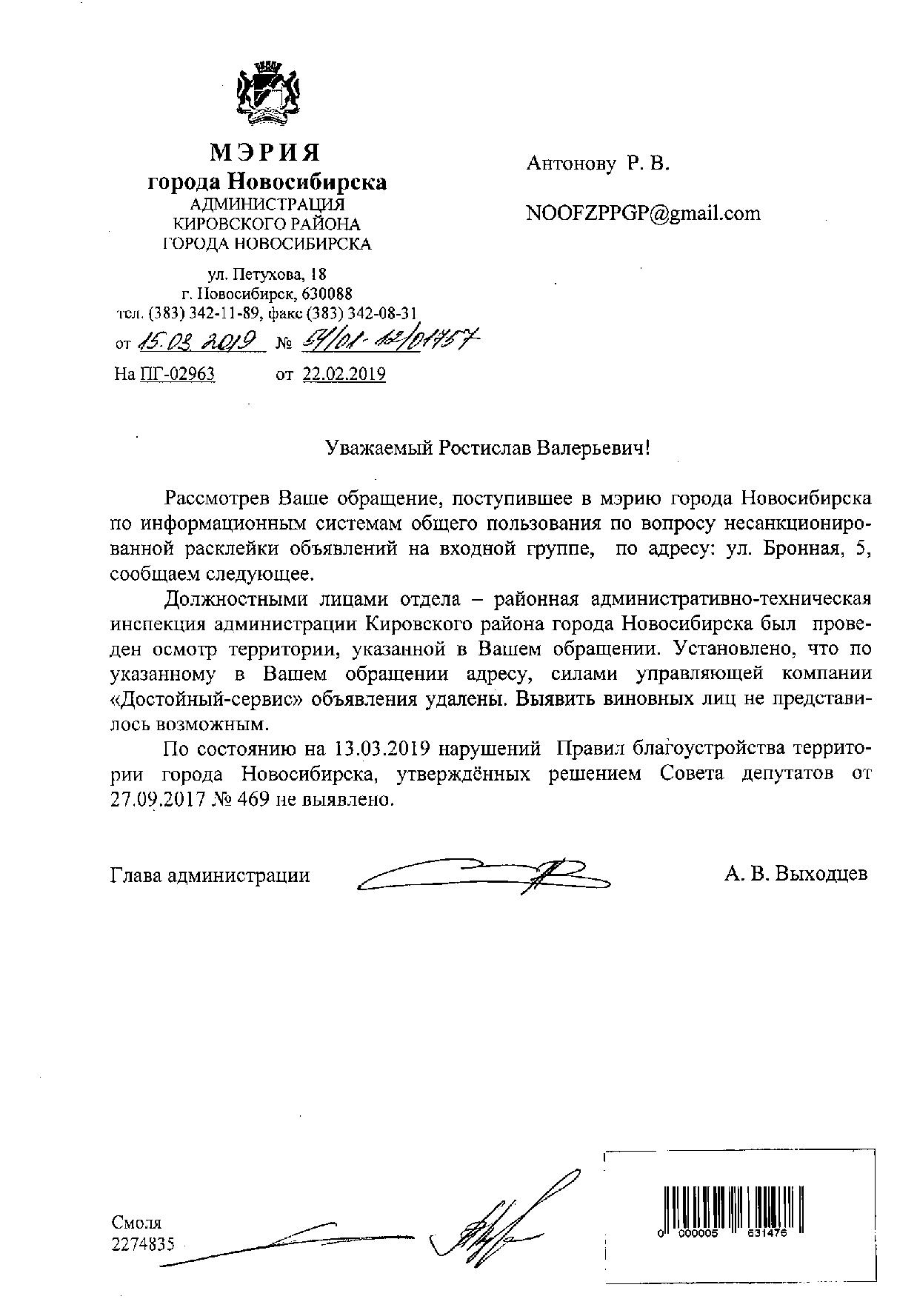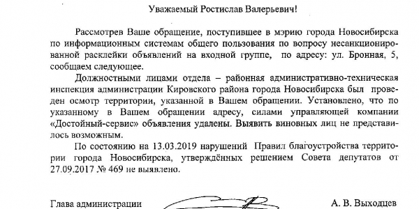 Номер жалобы:49942 Тип жалобы:Прочее Название объекта:Управляющая Компания Регион:Новосибирская область Город:Новосибирск Адрес:Бронная улица, 15 стр Описание жалобы:Объявления в неположенном месте Статус: