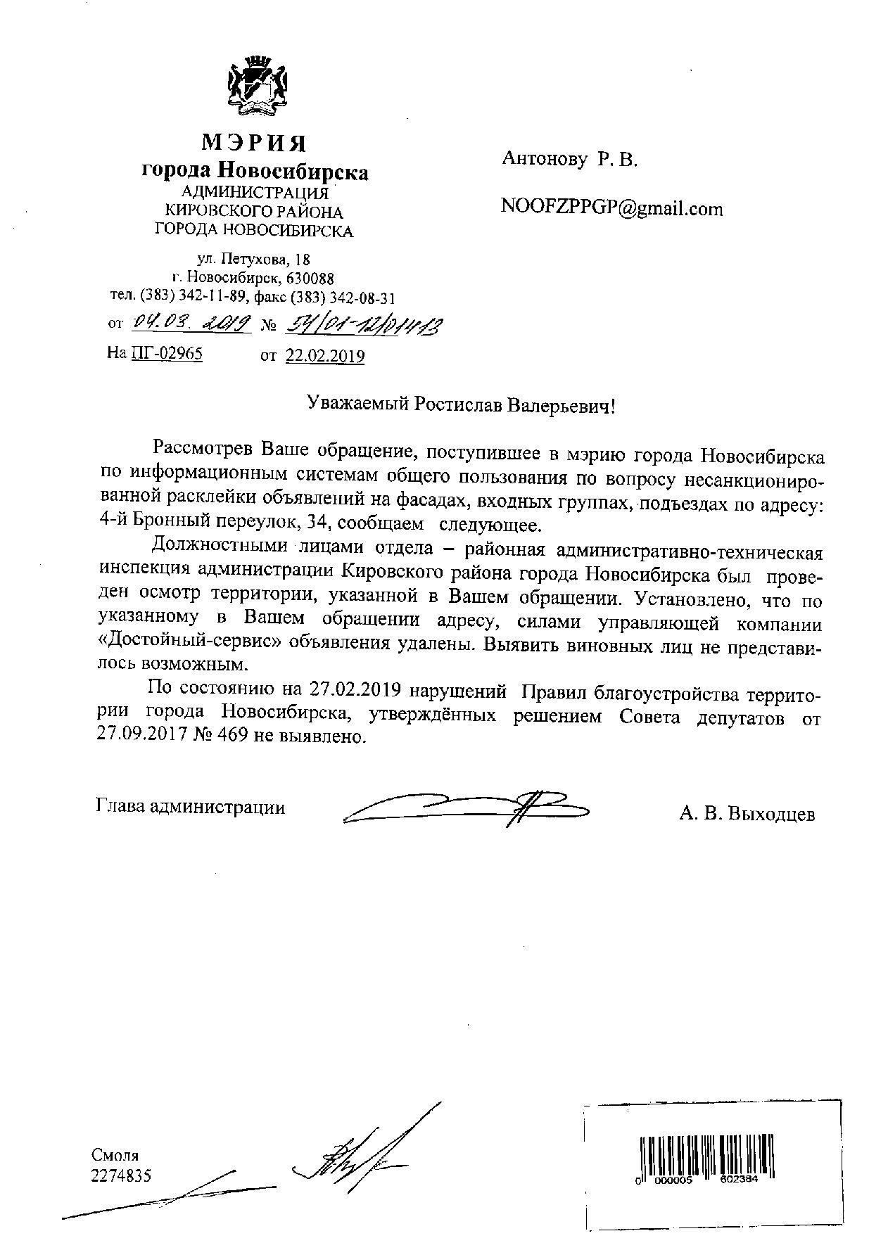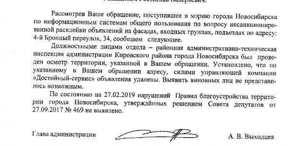 Номер жалобы:49911 Тип жалобы:Прочее Название объекта:Управляющая Компания Регион:Новосибирская область Город:Новосибирск Адрес:4-й Бронный переулок, 34 Описание жалобы:Бронная 24, объявления в неположенном месте Статус: