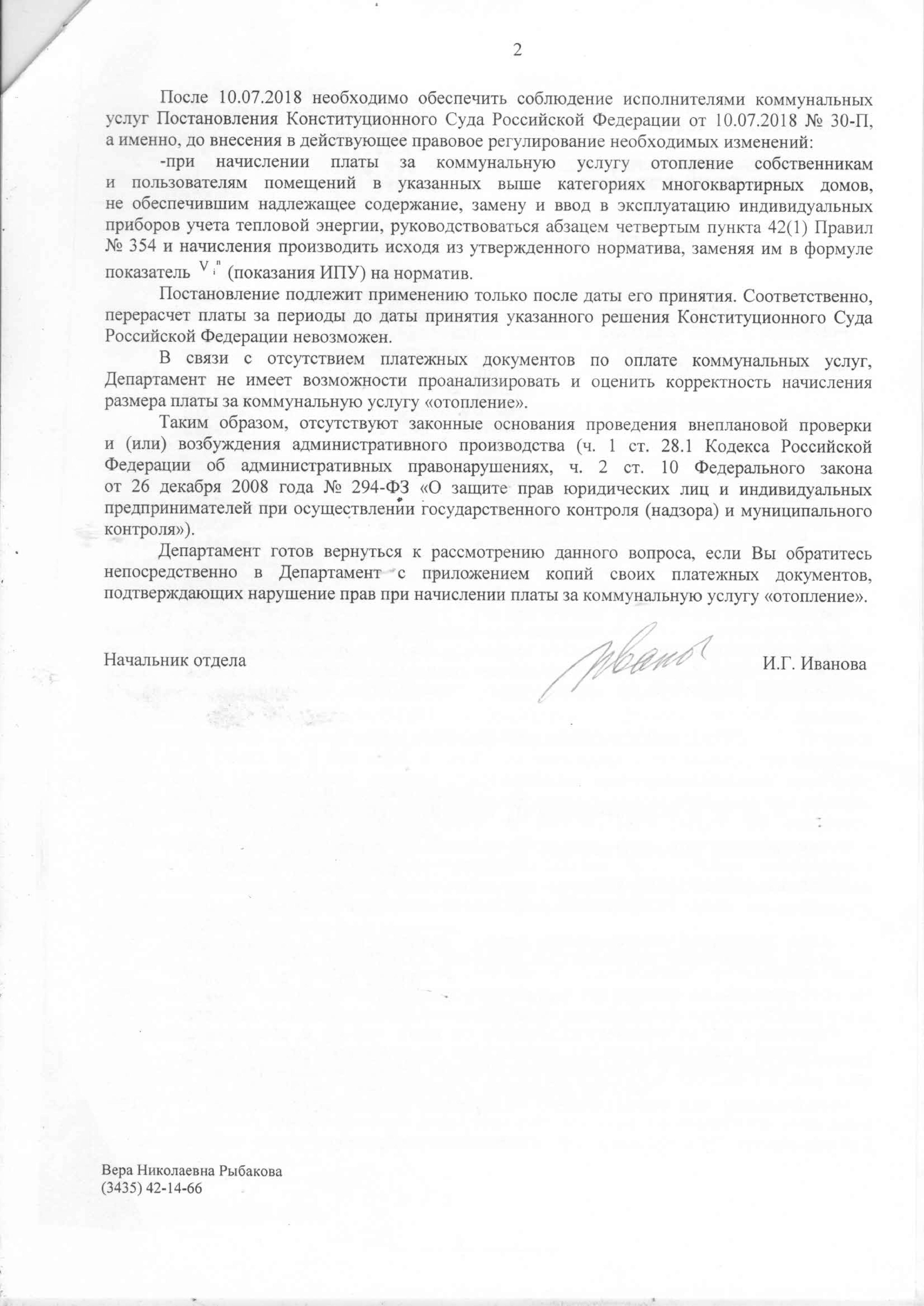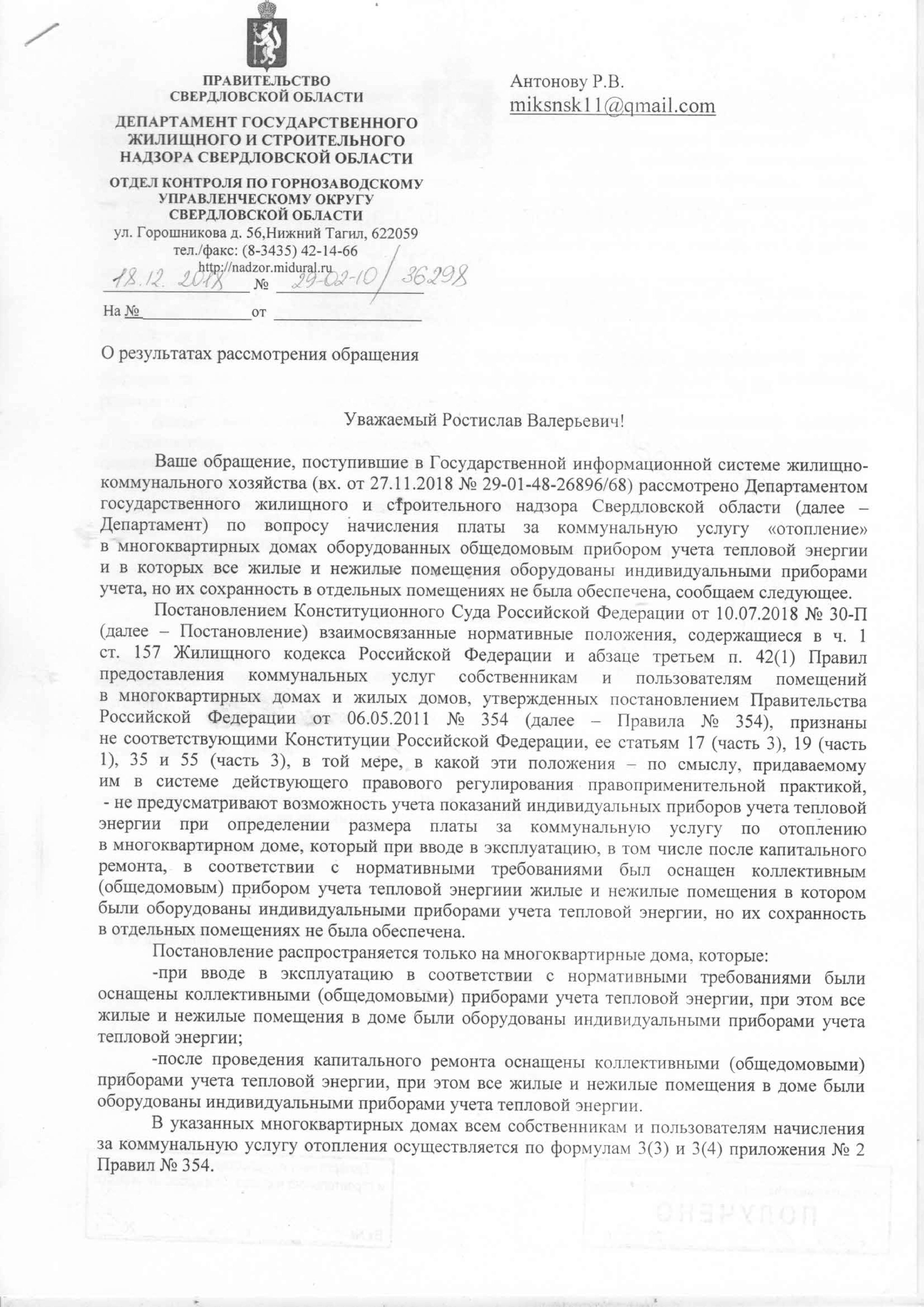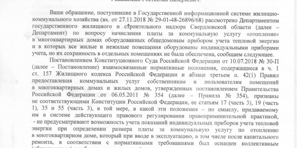 Вышеизложенное подтверждено решением Конституционного Суда г. Москва от 10.07.2018 года. Материалы дела находятся в открытом доступе. Просим принять меры. На письменные/устные заявления, управляющая компания не реагирует. ЕМРЦ отказываются принимать решение суда во внимание, по не попятным причинам. Управляющая компания не пытается встать на сторону жильцов и не разделяет интересов жильцов. Решение КС РФ, занимает высшее положение относительно постановления РФ, на которое ссылается УК при отказе принятия показаний по индивидуальным приборам учёта отопления. Данное решение КС РФ, полагаем, можно считать прецедентом, основываясь на котором любой суд встанет на сторону истцов. Мы не отказываемся платить, мы хотим справедливости, не более того. Требуем возобновления принятия показаний по индивидуальным приборам учёта отопления, а так же произвести перерасчёт денежных средств за оплаченные месяцы по «среднему». Мы уже не надеемся на смену управляющей компании, надеемся хотя бы справедливость. Мы так же не знаем куда направить данное обращение, пожалуйста помогите с выбором. С Уважением, жильцы МКД Ленинградский проспект 30Б, г. Нижний Тагил.