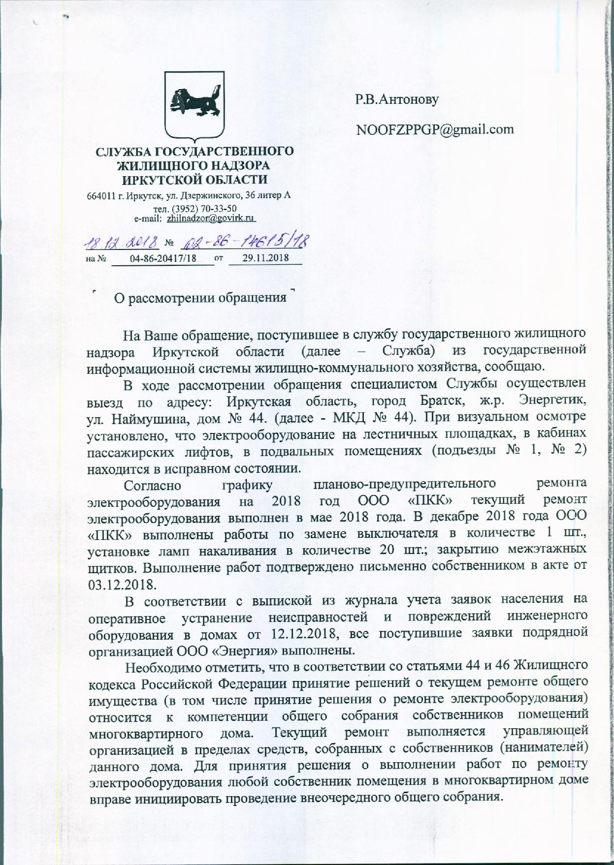 Номер жалобы:45991 Тип жалобы:Иные проблемы ЖКХ Название объекта: Регион:Иркутская область Город:Братск Адрес:улица Наймушина, 44 Описание жалобы:Нет освещения на межэтажных перекрытиях в подъездах Статус: