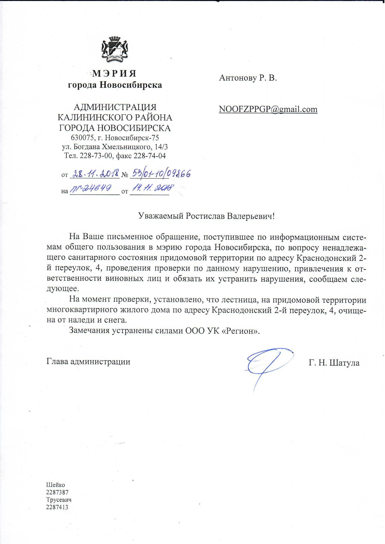 Номер жалобы:45059 Тип жалобы:Иные проблемы ЖКХ Название объекта:Управляющая Компания Регион:Новосибирская область Город:Новосибирск Адрес:пер 2-й Краснодонский, 4 Описание жалобы:Не расчищена лестница Статус:
