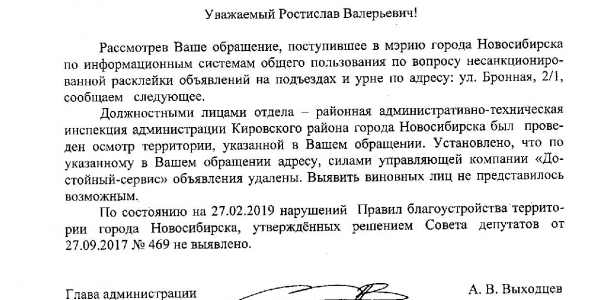 Номер жалобы:49857 Тип жалобы:Прочее Название объекта:Управляющая Компания Регион:Новосибирская область Город:Новосибирск Адрес:ул Бронная, 45/1 Описание жалобы:Объявления в неположенном месте