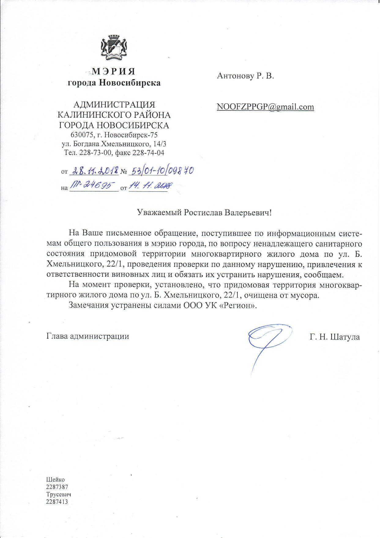 Номер жалобы:45027 Тип жалобы:Иные проблемы ЖКХ Название объекта:Управляющая Компания Регион:Новосибирская область Город:Новосибирск Адрес:ул Богдана Хмельницкого, 22 Описание жалобы:объявления в неположенном месте Статус: