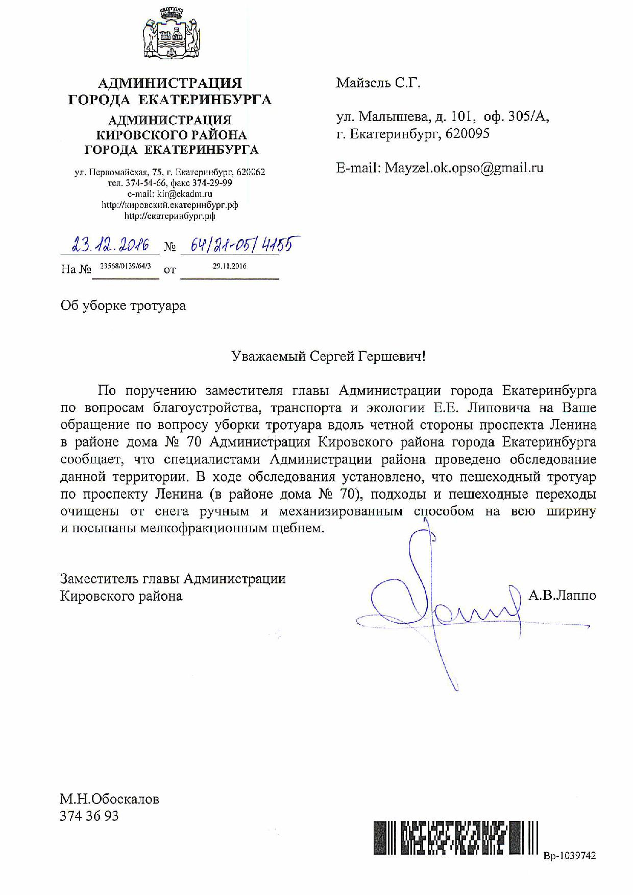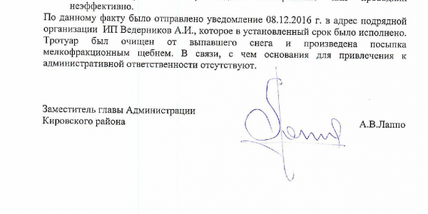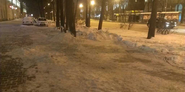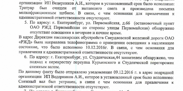 Номер жалобы:10965 Тип жалобы:Качество уборки снега на тротуарах Название объекта:Администрация Екатеринбурга Регион:Свердловская область Город:Екатеринбург Адрес:просп. Ленина, 70 Описание жалобы:Тротуар на чётной стороне проспекта Ленина на участке от улицы Гагарина до въезда во двор дома 70 через проходную арку очищен от снега не по всей ширине. В данном месте тротуар расширяется до кустов, посаженных вдоль проезжей части. Очистка произведена только до деревьев, произрастающих на тротуаре. Вдобавок после снегопада 23 ноября в нарушение п. 51 правил благоустройства Екатеринбурга сметённый с тротуара снег был складирован вокруг стволов деревьев. Необходимо вывезти складированный у деревьев снег и очистить тротуар по всей ширине. Статус: