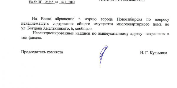 Номер жалобы:44956 Тип жалобы:Иные проблемы ЖКХ Название объекта:Управляющая Компания Регион:Новосибирская область Город:Новосибирск Адрес:ул Богдана Хмельницкого, 6 Описание жалобы:Надписи на фасаде дома закрашены не в тон Статус: