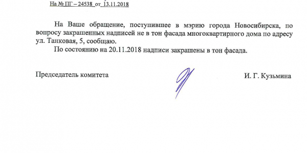 Номер жалобы:44948 Тип жалобы:Иные проблемы ЖКХ Название объекта:Управляющая Компания Регион:Новосибирская область Город:Новосибирск Адрес:ул Танковая, 3 Описание жалобы:Надписи на фасаде дома Статус: