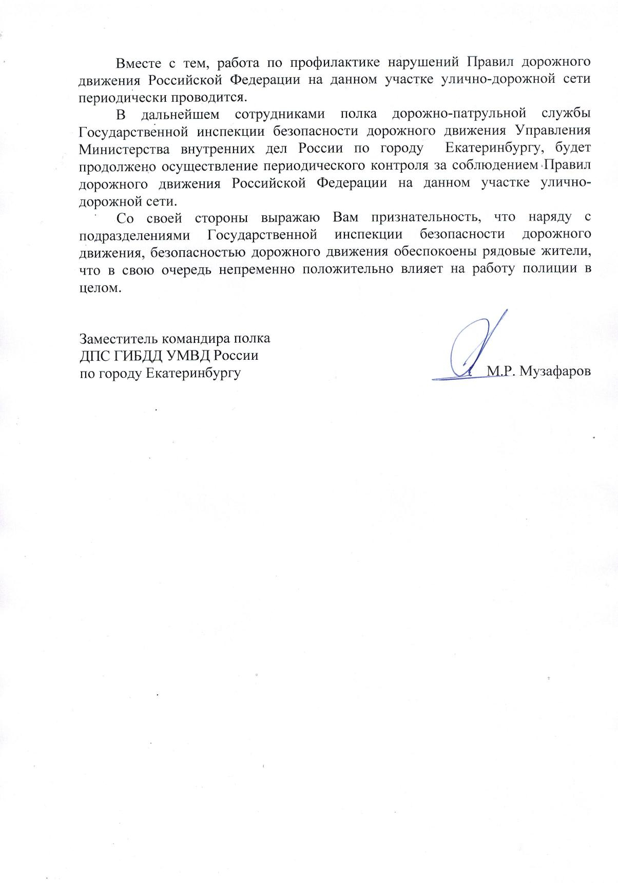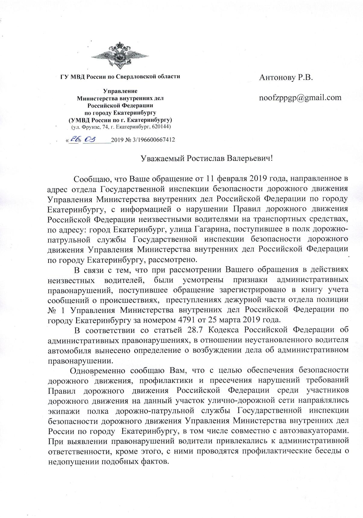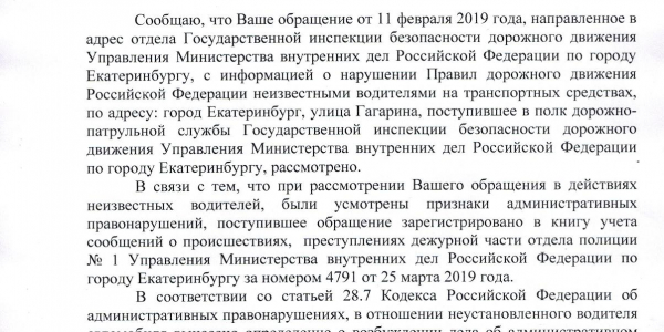 Номер жалобы:49312 Тип жалобы:Прочее Название объекта:ГИБДД Регион:Свердловская область Город:Екатеринбург Адрес:улица Гагарина, 35 Описание жалобы:Необходим контроль за соблюдением знаков 6.1 с табличкой 8.6.1 и 3.27, установленных в декабре 2018 года на нечётной стороне улицы Гагарина в районе домов 33 и 35. Статус: