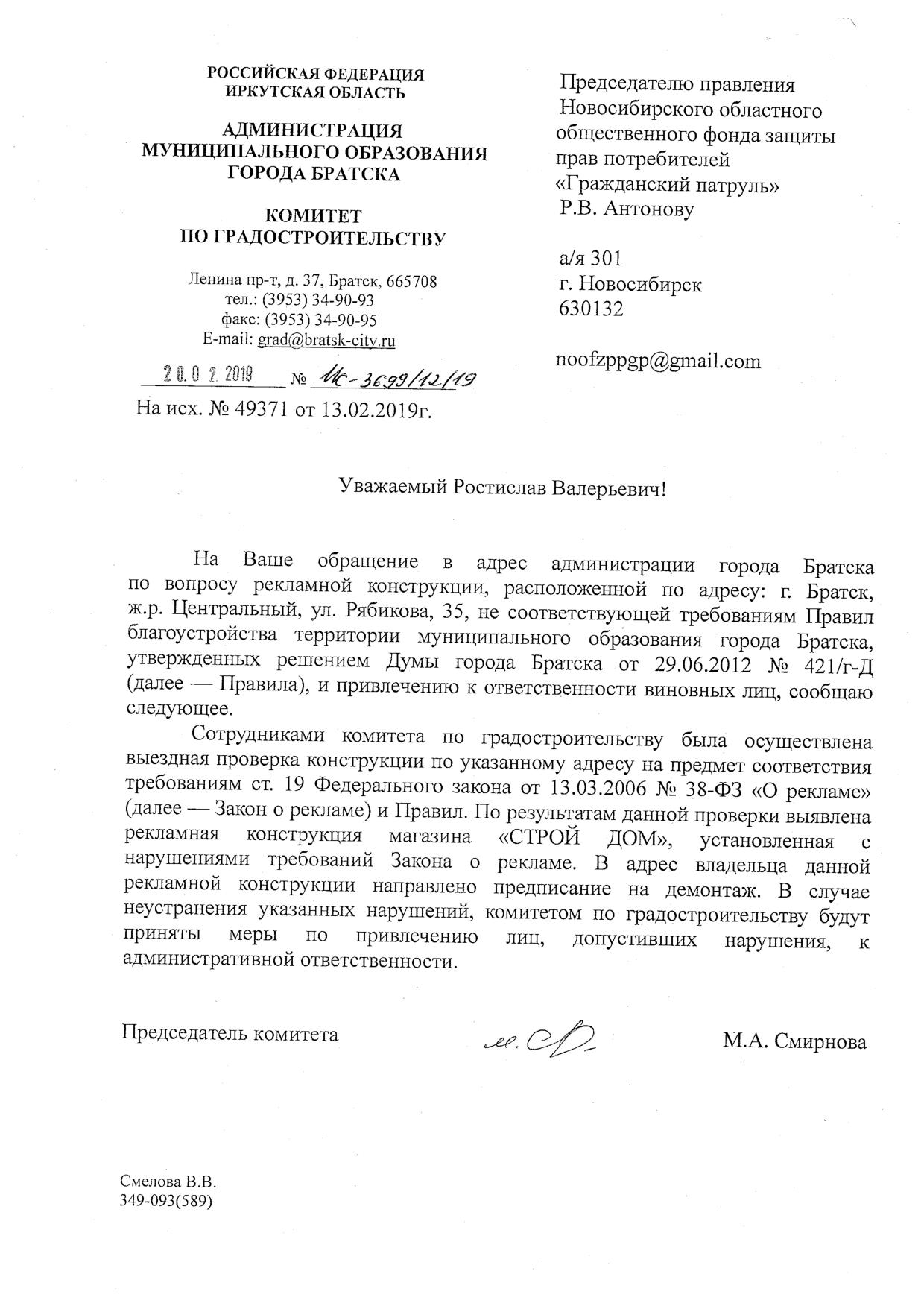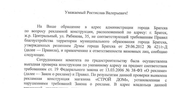 Номер жалобы:49371 Тип жалобы:Прочее Название объекта: Регион:Иркутская область Город:Братск Адрес:Братск, улица Рябикова, 35 Описание жалобы:Незаконно размещенная реклама Статус:
