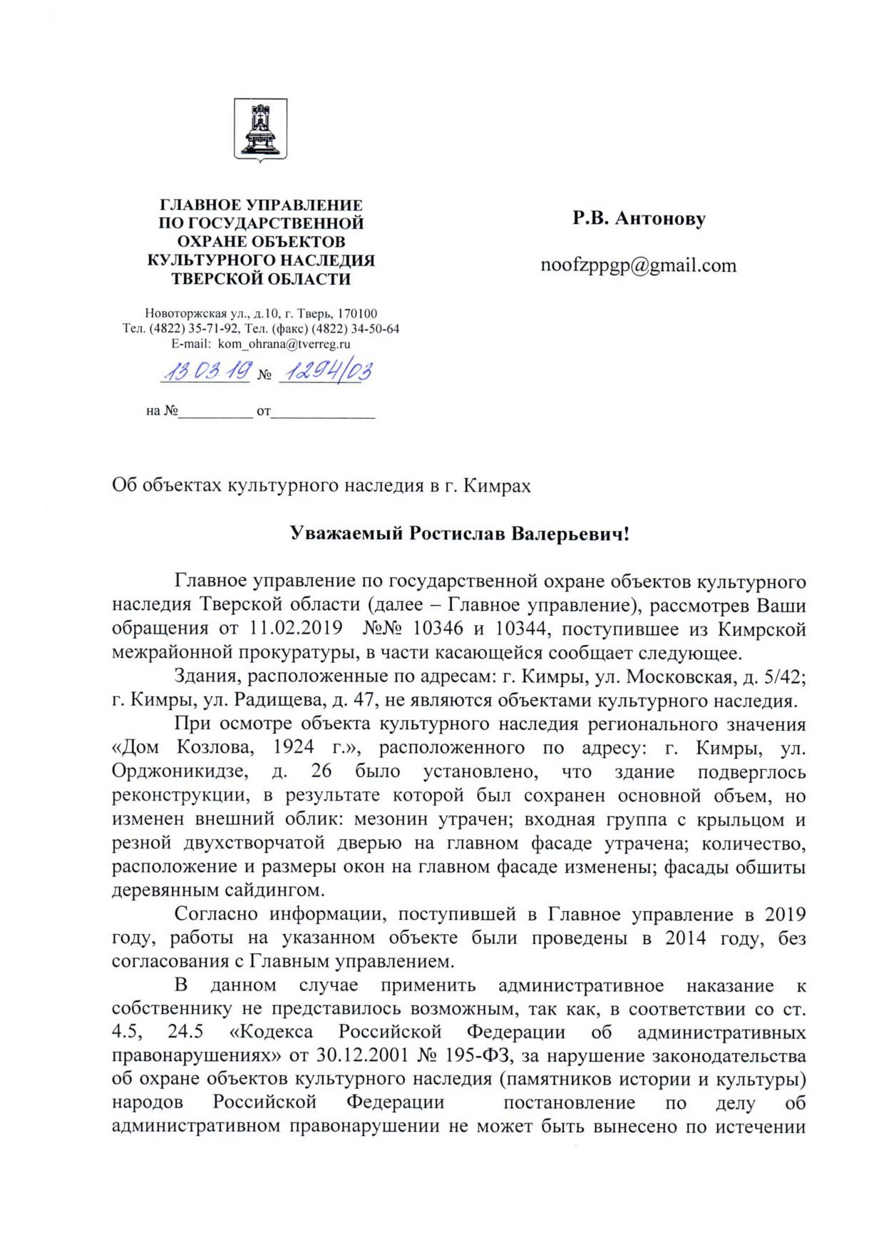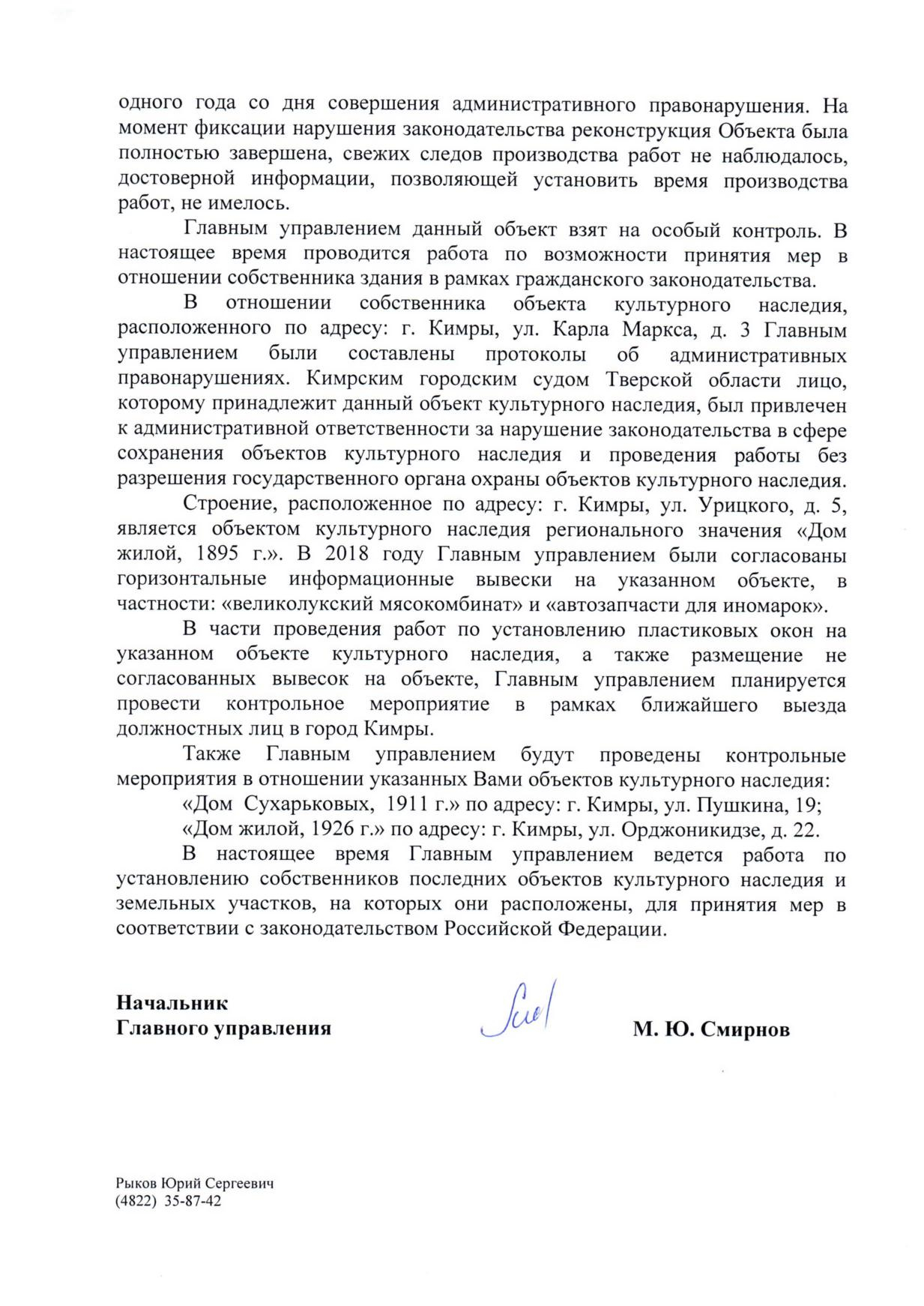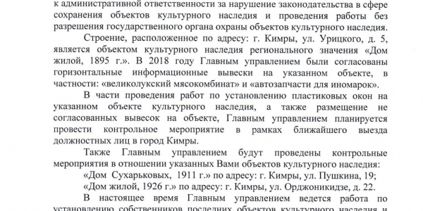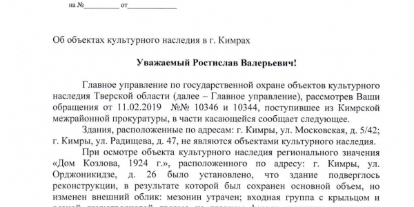 Номер жалобы:49292 Тип жалобы:Прочее Название объекта: Регион:Тверская область Город:Кимры Адрес:улица Радищева, 47 Описание жалобы:В списке окн не значится, но законность изменения архитектурного решения фасада, втч изменение формы окон и снос, крыльца под вопросом. Статус: