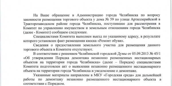 Номер жалобы:49270 Тип жалобы:Прочее Название объекта: Регион:Челябинская область Город:Челябинск Адрес:Артиллерийская улица, 59 Описание жалобы:Заброшенный ларёк в сквере перед домом 59 по Артиллерийской Статус: