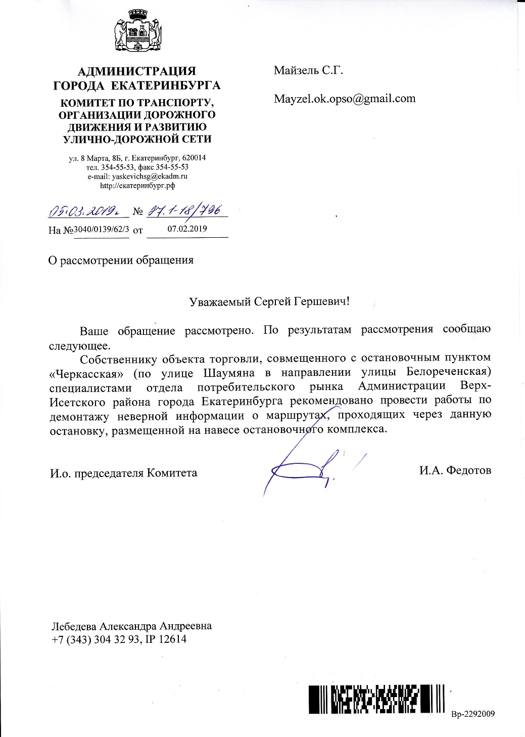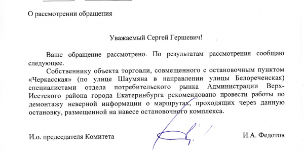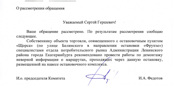 Номер жалобы:49208 Тип жалобы:Прочее Название объекта: Регион:Свердловская область Город:Екатеринбург Адрес:улица Белинского, 141 Описание жалобы:Не правильный список маршрутов на навесе автобусной остановки Щорса в сторону ост. Фрунзе. Фактически проезжают маршруты: А 2,19,030,077, Т1,5,6,9,11,14,15,20 Статус: