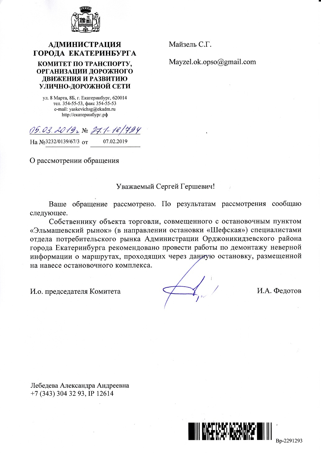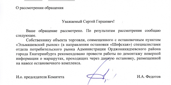 Номер жалобы:49209 Тип жалобы:Прочее Название объекта: Регион:Свердловская область Город:Екатеринбург Адрес:Шефская улица, 2Г Описание жалобы:Не правильный список маршрутов на навесе автобусной остановки Эльмашевский рынок в сторону ост. Шефская. Фактически проезжают маршруты: 09,033,060,148 Статус: