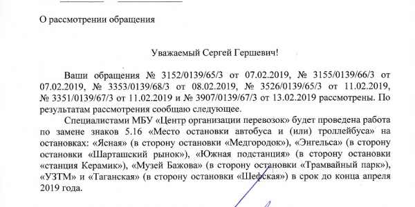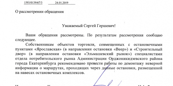 Номер жалобы:49213 Тип жалобы:Прочее Название объекта: Регион:Свердловская область Город:Екатеринбург Адрес:улица Бакинских Комиссаров, 64 Описание жалобы:Не правильный список маршрутов на навесе автобусной остановки Ярославская в сторону ост. Веер. Фактически проезжают маршруты:А 059, Т 3,5,12 Статус: