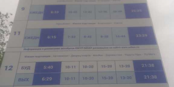 Номер жалобы:49211 Тип жалобы:Прочее Название объекта: Регион:Свердловская область Город:Екатеринбург Адрес:Селькоровская улица, 109 Описание жалобы:Не правильный список маршрутов на знаке "Место остановки автобуса", также не соответствует списку на расписании, у остановки Южная подстанция в сторону ост. Станция Керамик. Фактически проезжают маршруты:9,11,11м,12,016. Статус:
