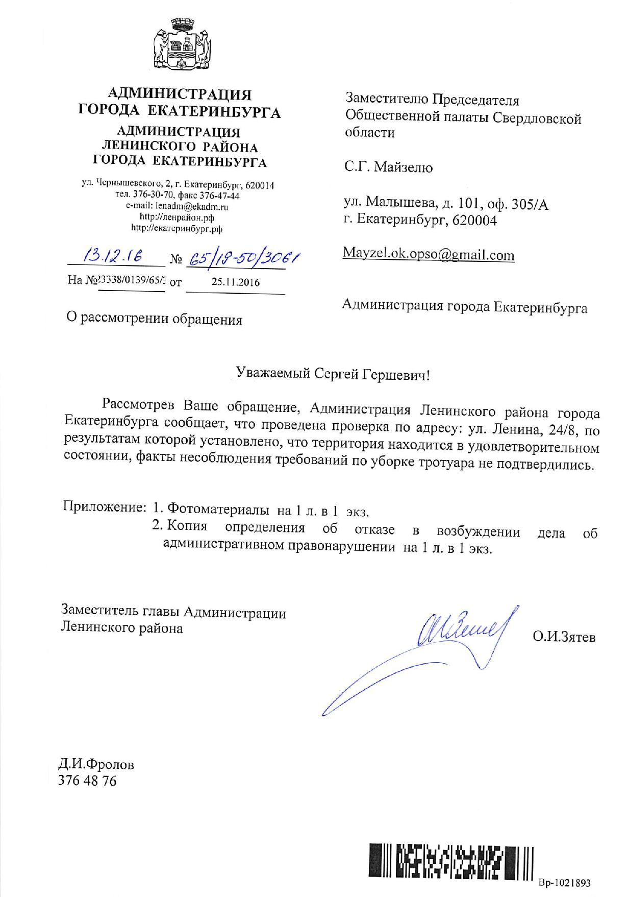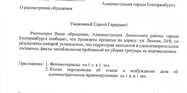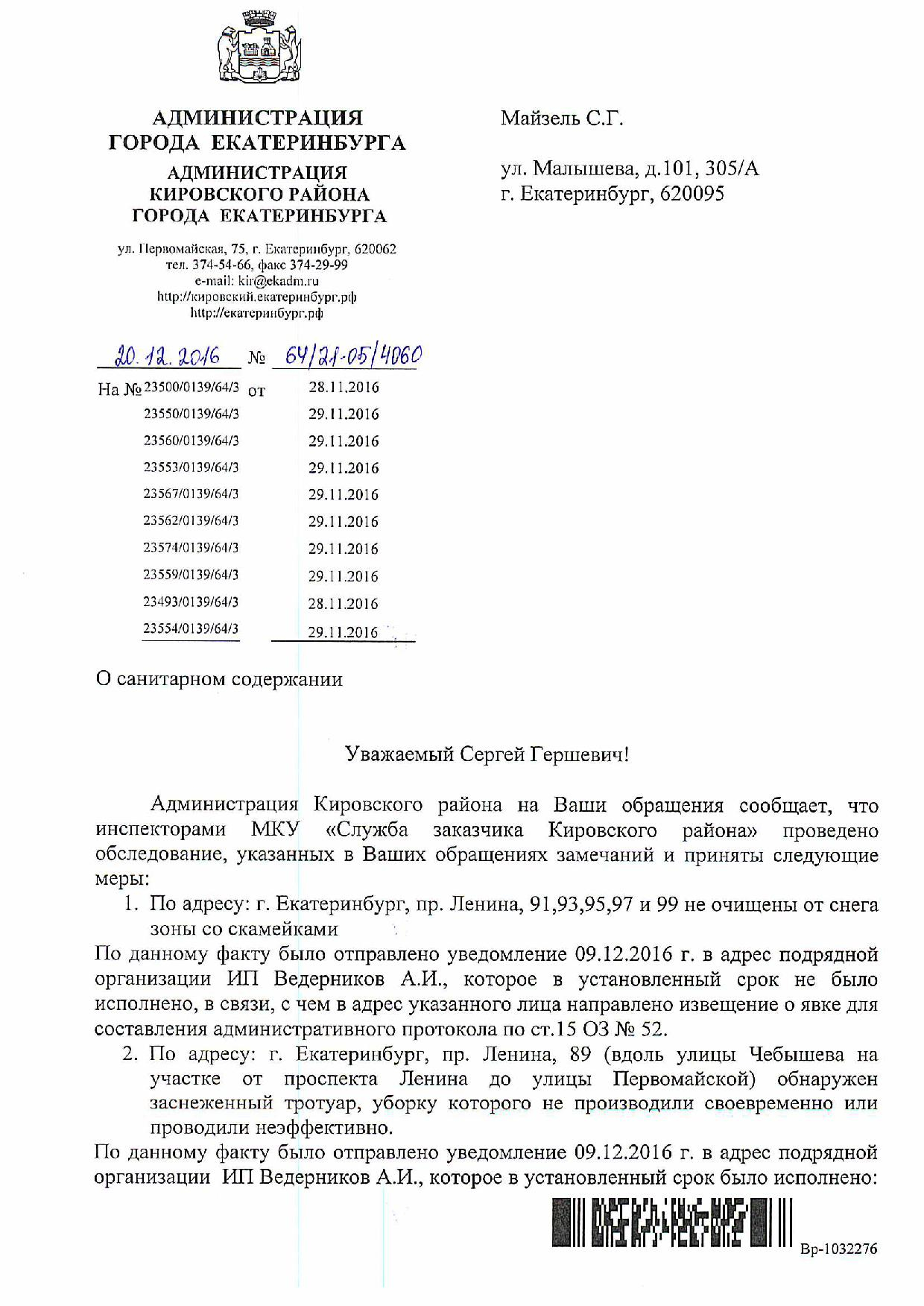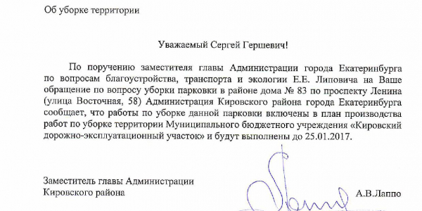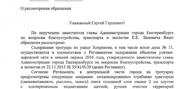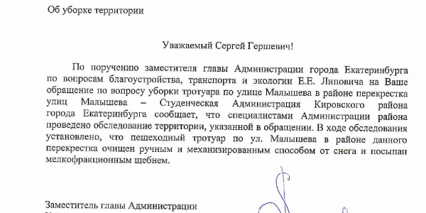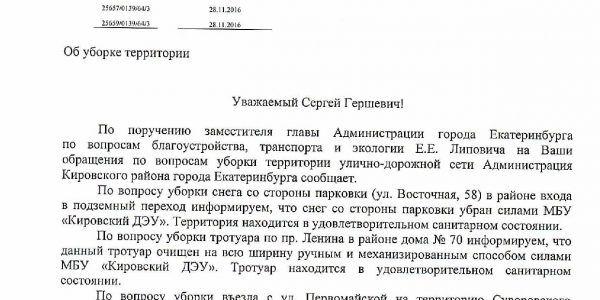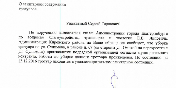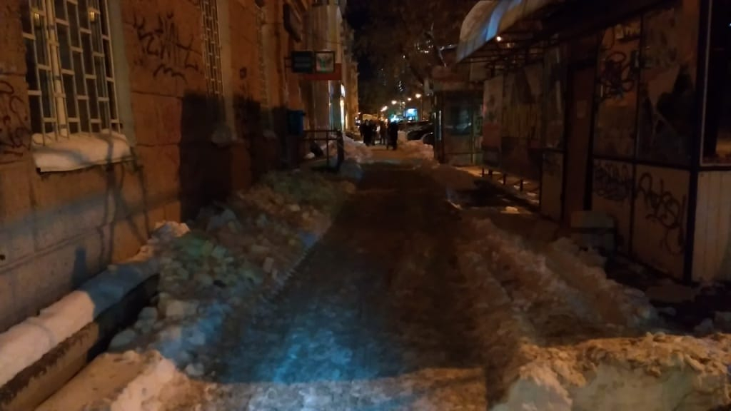 Номер жалобы:10947 Тип жалобы:Качество уборки снега на тротуарах Название объекта:Администрация Екатеринбурга Регион:Свердловская область Город:Екатеринбург Адрес:ул. Мира, 11 Описание жалобы:Тротуар вдоль нечётной стороны улицы Мира на участке от улицы Академической до улицы Первомайской некачественно очищен от снега. Очистка была произведена не до покрытия, от колёс уборочной техники оставлены колеи. Интенсивное движение пешеходов привело к уплотнению снега и образованию гололёда. Необходимо произвести очистку данного тротуара до покрытия. Статус: