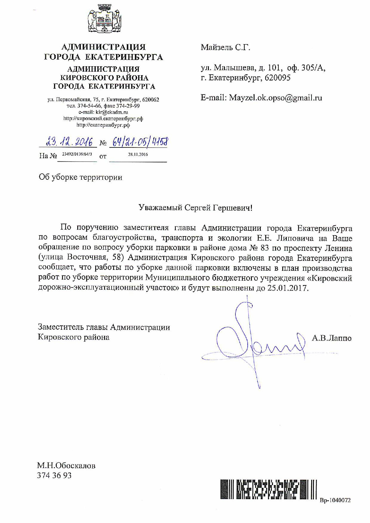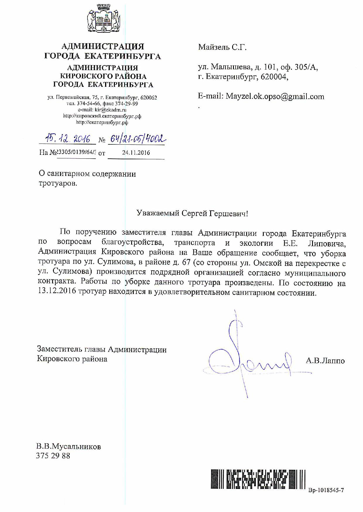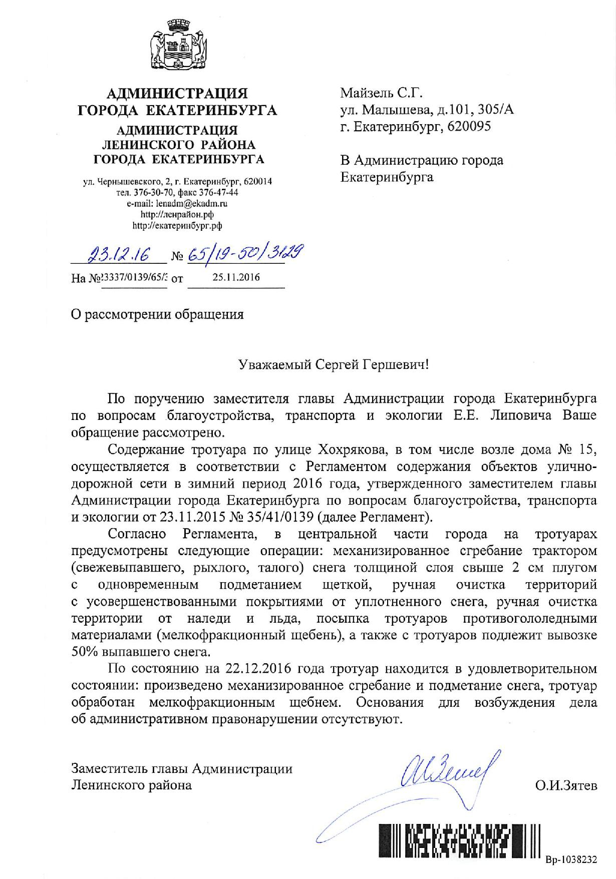 Номер жалобы:10947 Тип жалобы:Качество уборки снега на тротуарах Название объекта:Администрация Екатеринбурга Регион:Свердловская область Город:Екатеринбург Адрес:ул. Мира, 11 Описание жалобы:Тротуар вдоль нечётной стороны улицы Мира на участке от улицы Академической до улицы Первомайской некачественно очищен от снега. Очистка была произведена не до покрытия, от колёс уборочной техники оставлены колеи. Интенсивное движение пешеходов привело к уплотнению снега и образованию гололёда. Необходимо произвести очистку данного тротуара до покрытия. Статус: