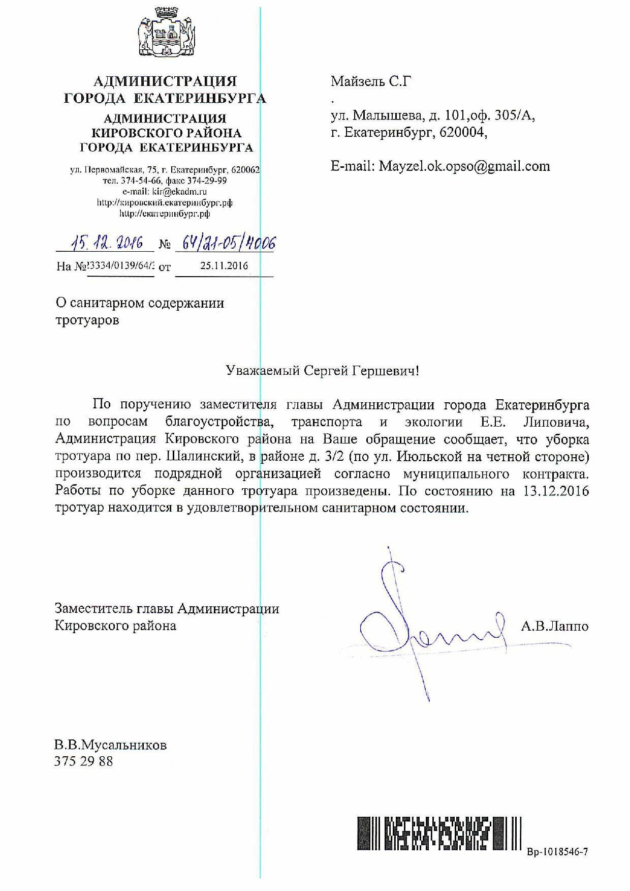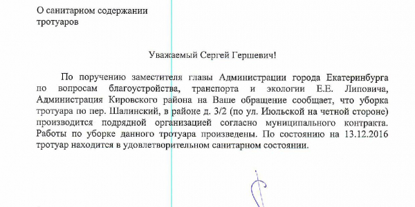 Номер жалобы:10881 Тип жалобы:Качество уборки снега на тротуарах Название объекта: Регион:Свердловская область Город:Екатеринбург Адрес:Шалинский, 3/2 Описание жалобы:На улице Июльской тротуар на четной стороне покрыт льдом, посыпка щебнем не производилась Статус: