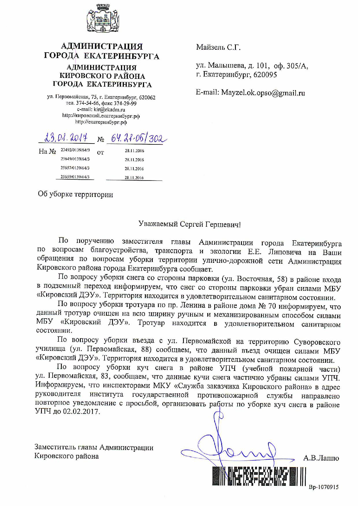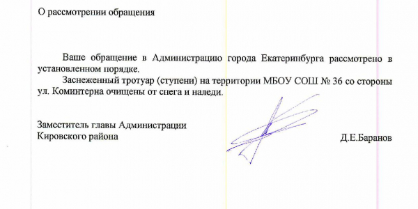 Номер жалобы:10944 Тип жалобы:Качество уборки снега на тротуарах Название объекта:Администрация Екатеринбурга Регион:Свердловская область Город:Екатеринбург Адрес:ул. Коминтерна, 1/136 Описание жалобы:Не очищены от снега ступени между направляющими пандуса на лестнице из сквера перед школой 36 на улицу Коминтерна. Статус: