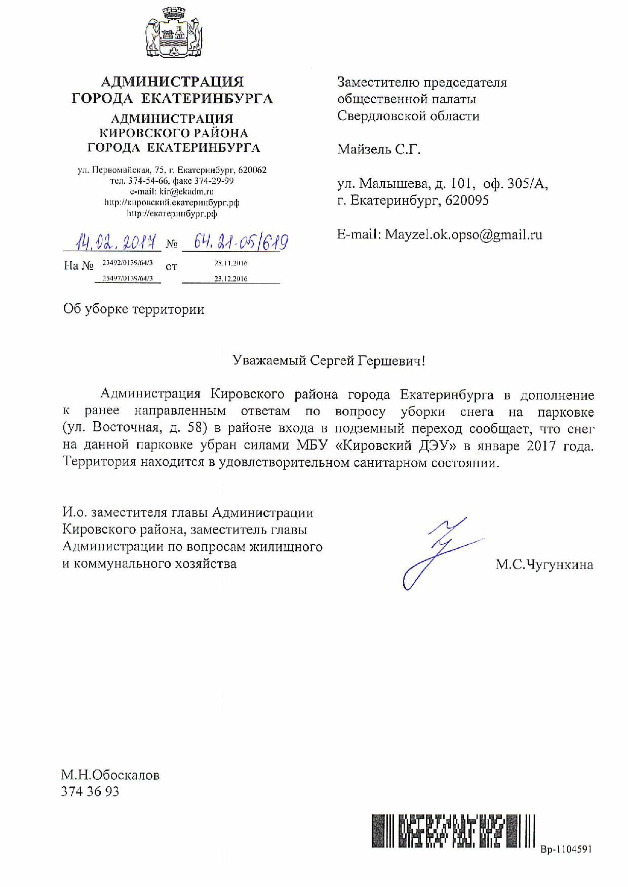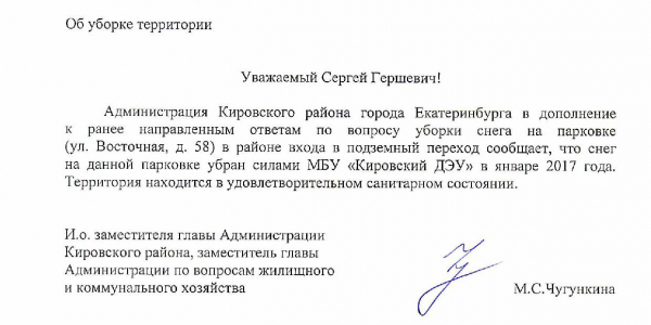 Номер жалобы:10942 Тип жалобы:Качество уборки снега на тротуарах Название объекта:Администрация Екатеринбурга Регион:Свердловская область Город:Екатеринбург Адрес:Восточная ул., 58 Описание жалобы:Отсутствует уборка снега на стоянке, на которую выходит один из входов в подземный переход. Статус: