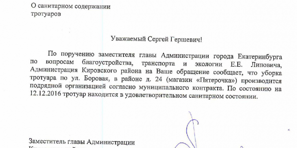 Номер жалобы:10882 Тип жалобы:Качество уборки снега на тротуарах Название объекта: Регион:Свердловская область Город:Екатеринбург Адрес:Боровая, 24 Описание жалобы:Не производится уборка снега у магазина "Пятёрочка" Статус: