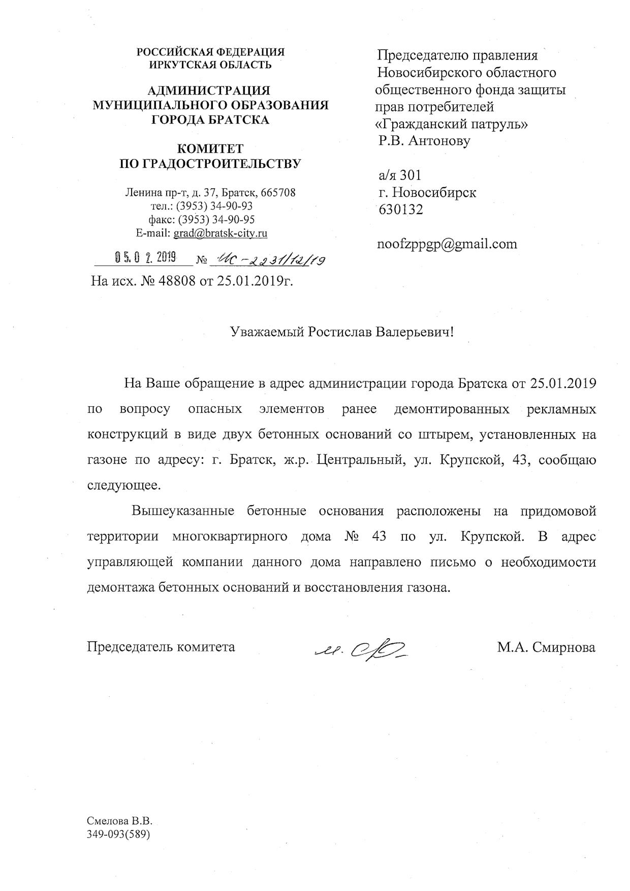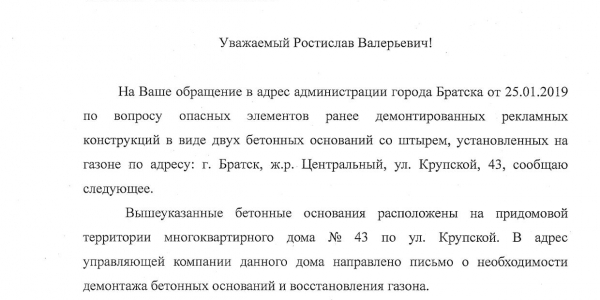 Номер жалобы:48808 Тип жалобы:Прочее Название объекта: Регион:Иркутская область Город:Братск Адрес:Братск, улица Крупской, 43 Описание жалобы:Опасные остатки рекламных конструкций, штыри Статус: