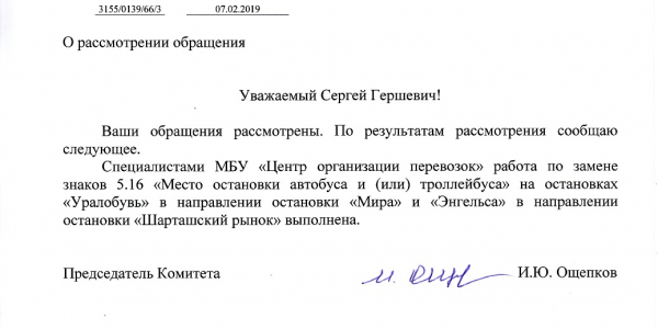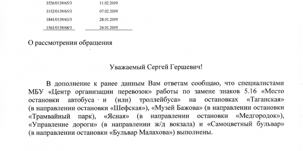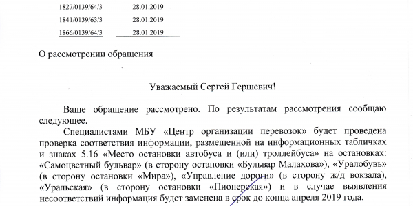 Номер жалобы:48825 Тип жалобы:Прочее Название объекта: Регион:Свердловская область Город:Екатеринбург Адрес:Екатеринбург, улица Щербакова Описание жалобы:Не правильный список маршрутов на знаке "Место остановки автобуса" у остановки Уктус в сторону ост. Каменный ручей. Фактически проезжают маршруты:А17,19,38,05,039,042; Т1, 16 Статус: