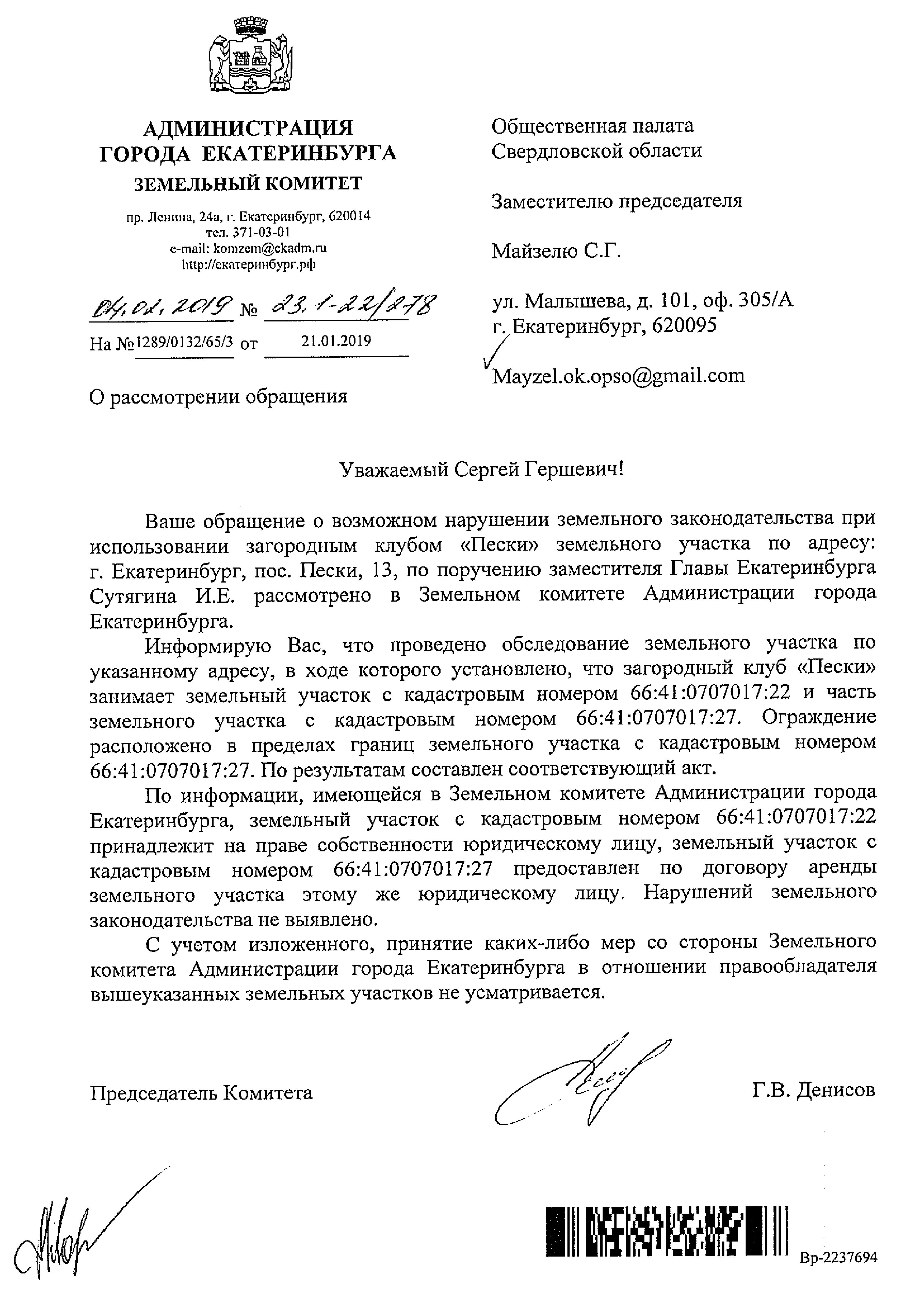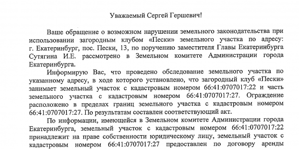 Номер жалобы:48499 Тип жалобы:Прочее Название объекта:ГКУ СО Верх-Исетское лесничество Регион:Свердловская область Город:Екатеринбург Адрес:улица Посёлок Пески, 13 Описание жалобы:Незаконное занятие территории Шарташского лесопарка базой отдыха «Пески». Базе принадлежит земельный участок 66:41:0707017:22. Однако некоторые постройки базы находятся за пределами этого участка. Занятая территория лесопарка обнесена забором, препятствующим свободному доступу граждан. Служебный въезд на территорию организован по тропе здоровья. Статус:
