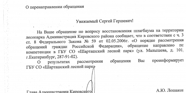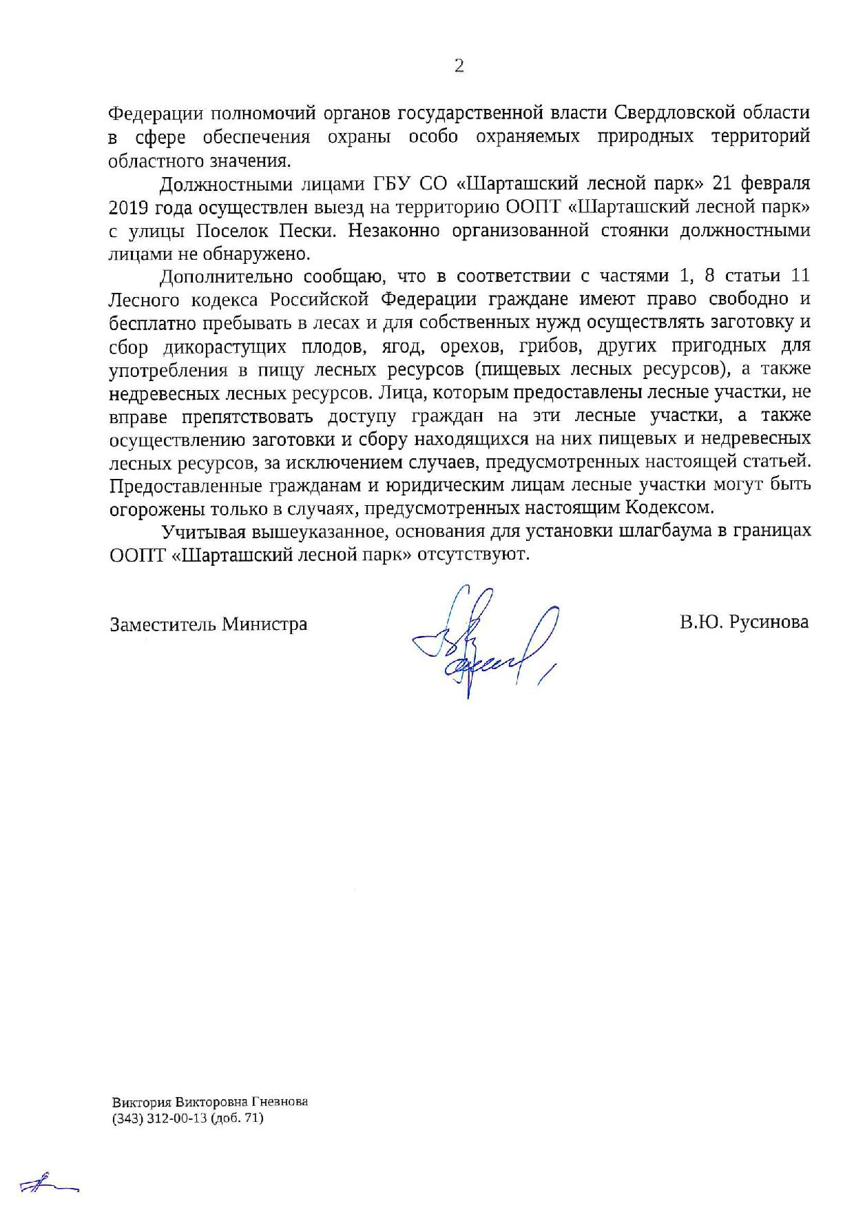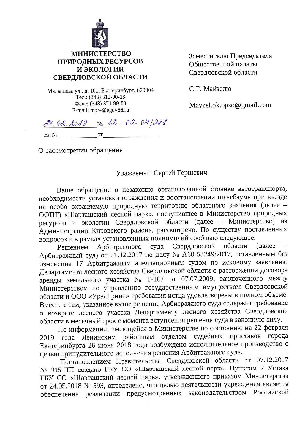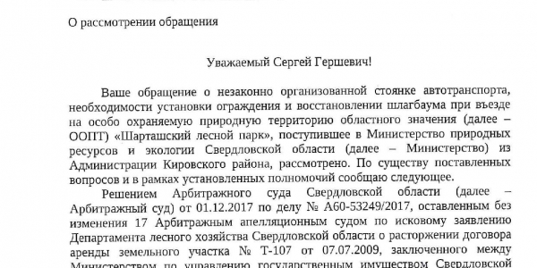 Номер жалобы:48501 Тип жалобы:Прочее Название объекта:ГКУ СО Верх-Исетское лесничество Регион:Свердловская область Город:Екатеринбург Адрес:Посёлок Пески, 13а Описание жалобы:Пляжным комплексом «SunDali» на территории Шарташского лесопарка незаконно организована стоянка автотранспорта. Необходимо установить ограждения, препятствующие заезду автотранспорта на территорию лесопарка с улицы Посёлок Пески, а также восстановить шлагбаум на грунтовой дороге в месте с координатами 56.845594° N, 60.700555° E. Статус: