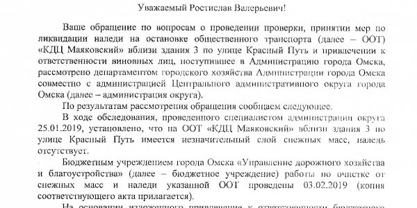 Номер жалобы:48617 Тип жалобы:Прочее Название объекта: Регион:Омская область Город:Омск Адрес:Омск, улица Красный Путь, 3 Описание жалобы:Сильнейший гололед на остановке по этому адресу Статус: