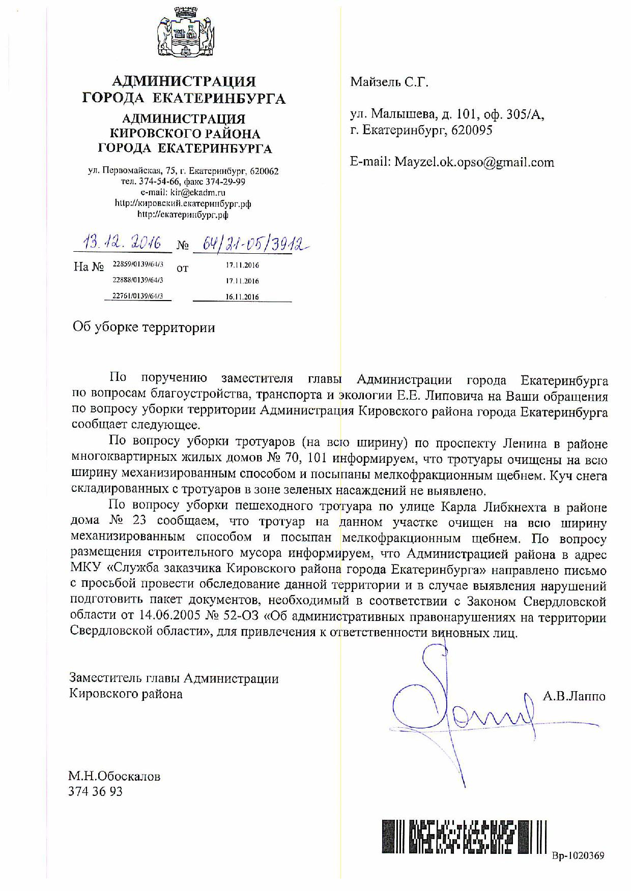 Номер жалобы:10795 Тип жалобы:Качество уборки снега на тротуарах Название объекта:Администрация Екатеринбурга Регион:Свердловская область Город:Екатеринбург Адрес:просп. Ленина, 70 Описание жалобы:Тротуар на чётной стороне Ленина на участке от улицы Гагарина до въезда во двор через проходную арку очищен на половину ширины. Счищенный с тротуара снег в нарушение санитарных норм складирован у стволов деревьев, произрастающих на краю тротуара. На перекрёстке Ленина и Гагарина в центре тротуара лежит куча снега, мешающая проходу. Статус: