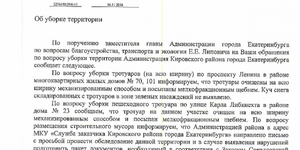 Номер жалобы:10778 Тип жалобы:Качество уборки снега на тротуарах Название объекта:Администрация Екатеринбурга Регион:Свердловская область Город:Екатеринбург Адрес:просп. Ленина, 48 Описание жалобы:Тротуар на чётной стороне Ленина в районе домов 48 и 50 покрыт ледяной коркой. Посыпка тротуара щебнем произведена, но его количество недостаточно для предотвращения скользкости. Необходимо полностью очистить тротуар ото льда и снега, либо произвести дополнительную посыпку. Статус: