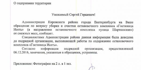 Номер жалобы:10800 Тип жалобы:Качество уборки снега на тротуарах Название объекта:Администрация Екатеринбурга Регион:Свердловская область Город:Екатеринбург Адрес:просп. Ленина, 101 Описание жалобы:Ежегодно на кусарниках живой изгороди, делящей тротуар на две половины, складируется снег, счищенный с тротуара. Это запрещено п. 51 правил благоустройства города Екатеринбурга. Необходимо вывезти снег, складированный на кустарниках, и принять меры по предотвращению его повторного складирования. Статус: