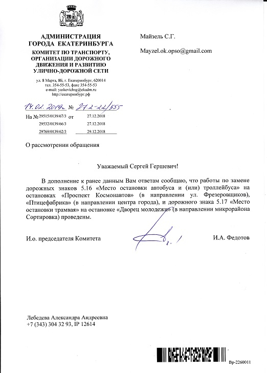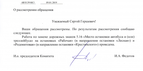 Номер жалобы:47954 Тип жалобы:Прочее Название объекта:Мэрия Регион:Свердловская область Город:Екатеринбург Адрес:проспект Ленина, 1 Описание жалобы:Неверный список маршрутов на знаке 5.17, установленном на трамвайной остановке «Дворец молодёжи» (в направлении Сортировки). Статус: