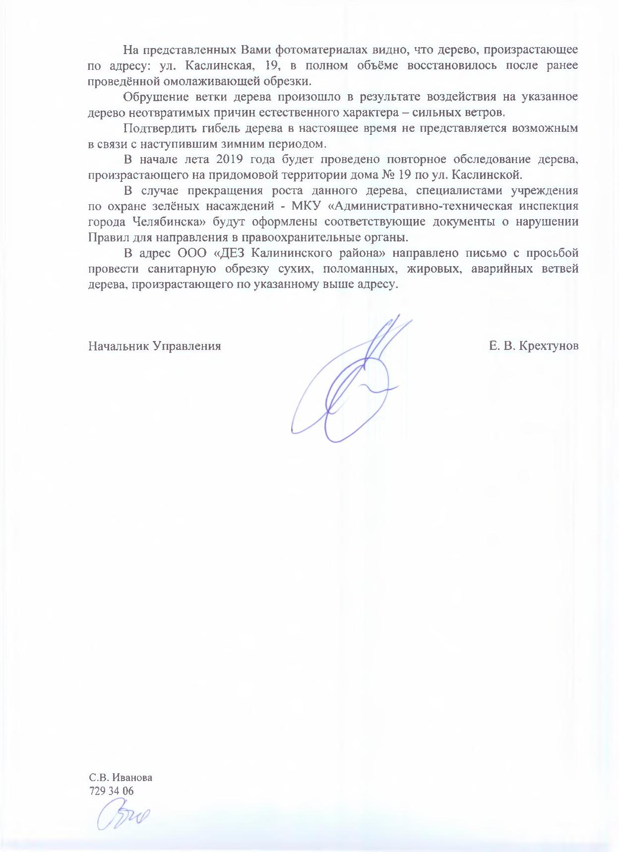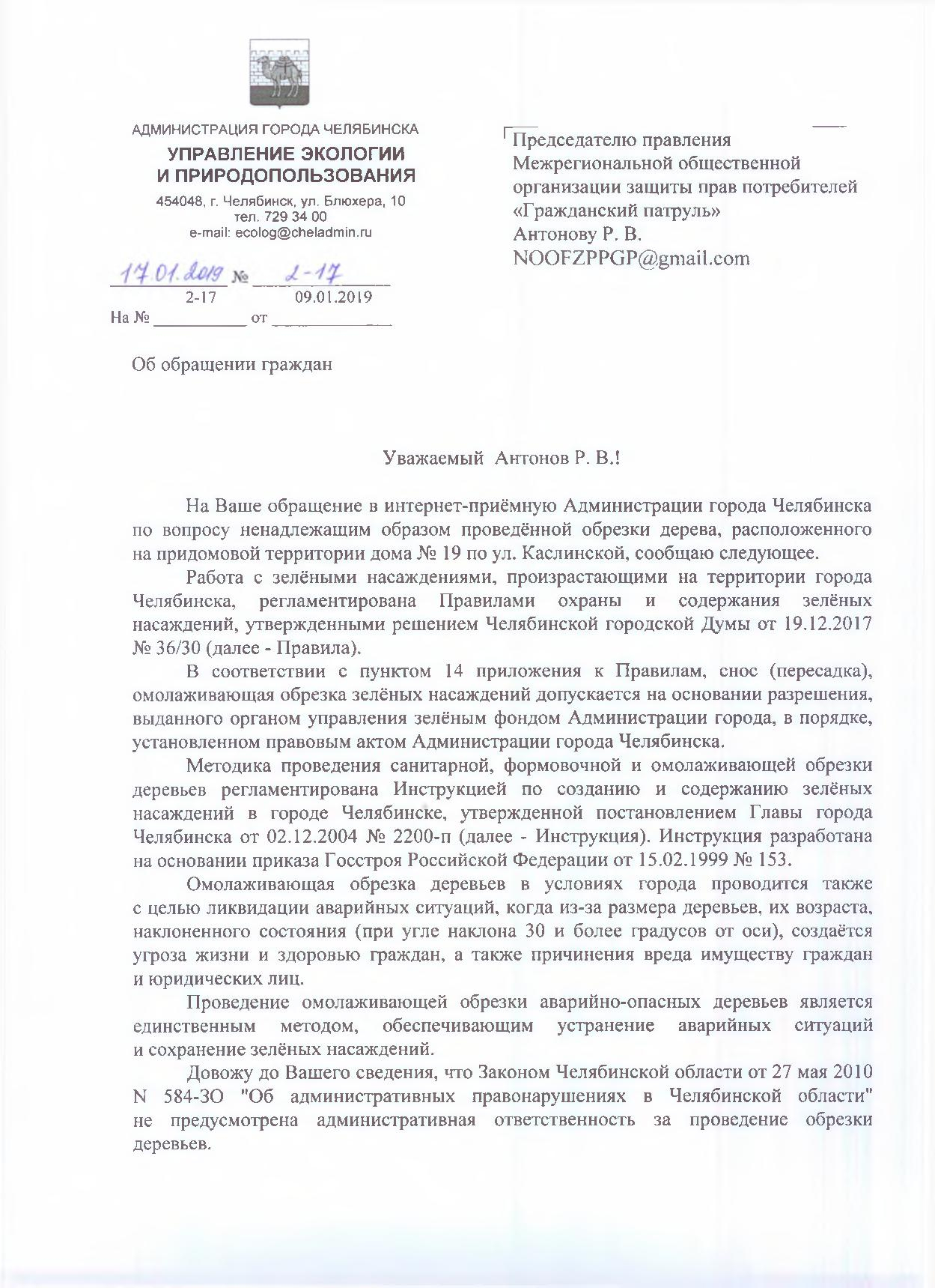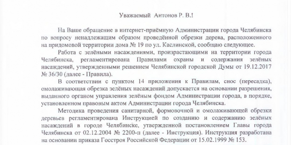 Номер жалобы:47973 Тип жалобы:Прочее Название объекта: Регион:Челябинская область Город:Челябинск Адрес:Челябинск, Каслинская улица, 19 Описание жалобы:Покалеченные дерево, после варварской обрезки, отломалась ветвь, дерево погибает Статус: