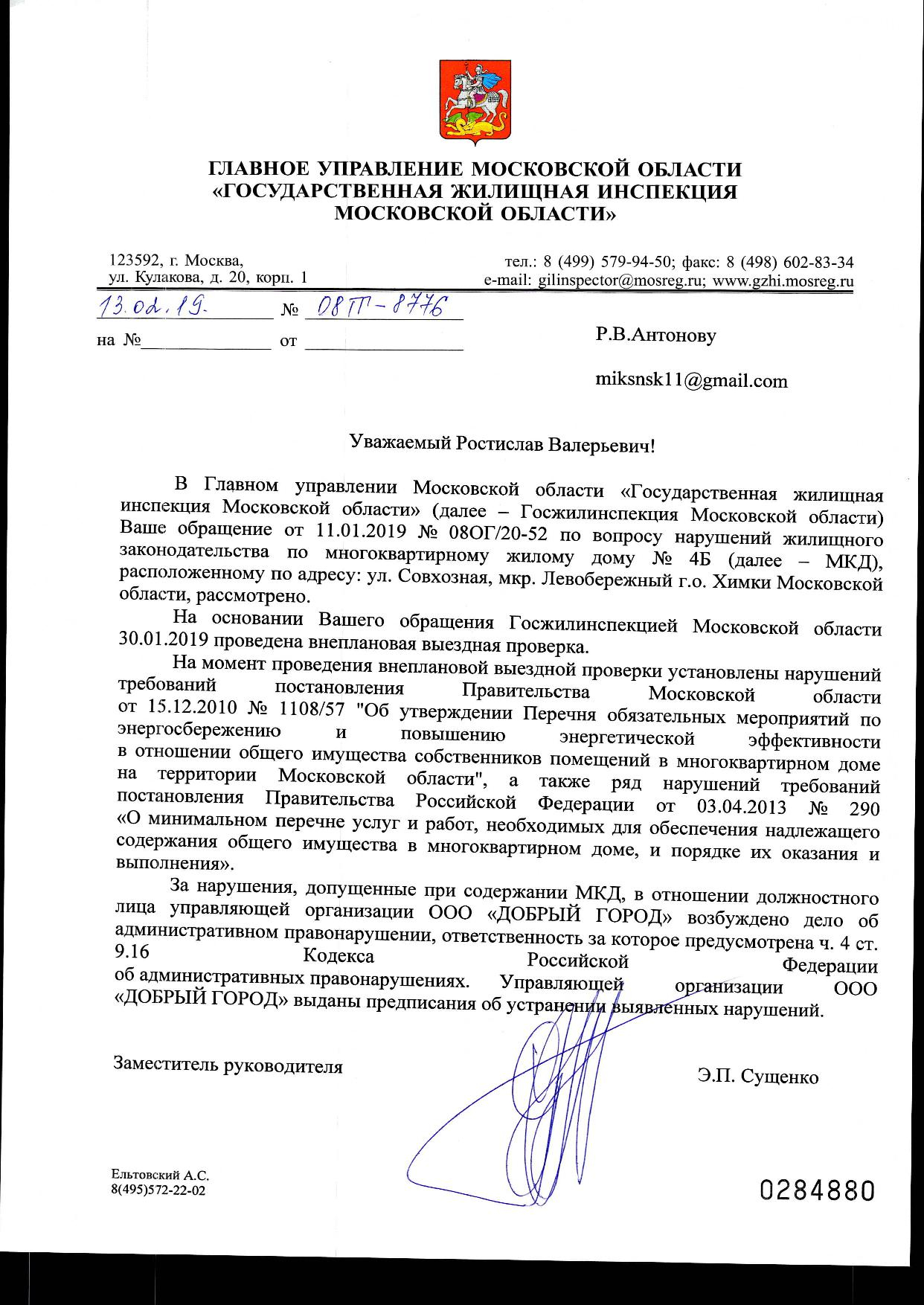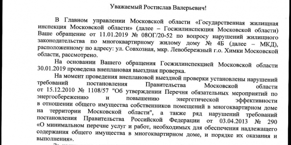 Номер жалобы:48005 Тип жалобы:Прочее Название объекта: Регион:Московская область Город:Химки Адрес:Совхозная улица, 4Б Описание жалобы:С лета не работает грузовой лифт в 1-м подъезде из-за замены. Плановый срок окончания ремонта прошёл, но лифт не работает. Ни в управляющей компании, ни в лифтовой организации, ни в администрации никто никакой информации не предоставляет. Статус: