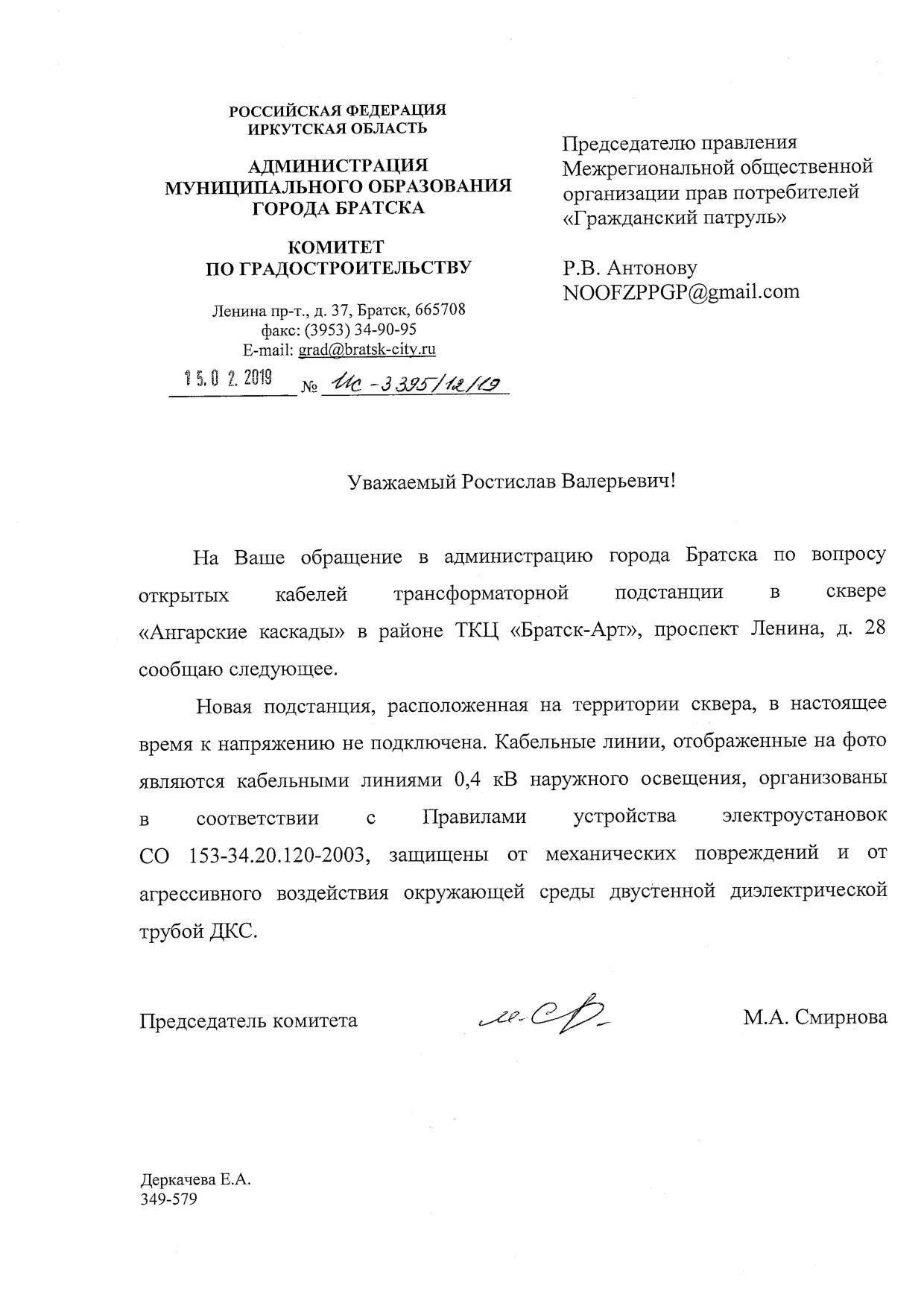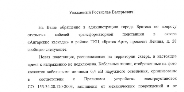 Номер жалобы:48076 Тип жалобы:Прочее Название объекта: Регион:Иркутская область Город:Братск Адрес:проспект Ленина, 28 Описание жалобы:Высоковольтные кабеля не скрыты существенной защитой в общественном месте, доступны для детей Статус: