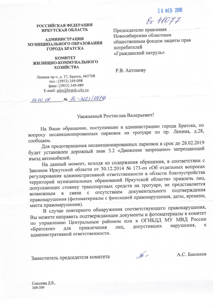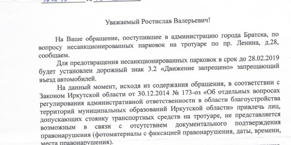 Номер жалобы:48077 Тип жалобы:Прочее Название объекта: Регион:Иркутская область Город:Братск Адрес:Братск, проспект Ленина, 28 Описание жалобы:Парковка автомобилей на тротуаре у входа в спортивный объект Статус: