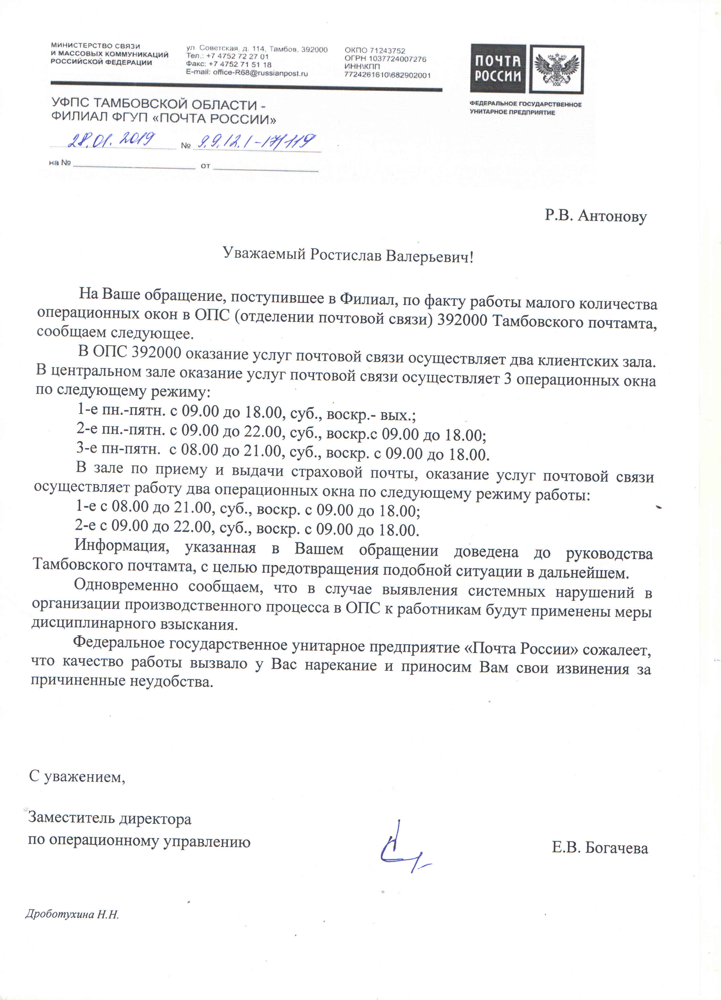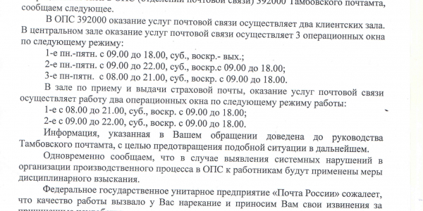 Номер жалобы:48092 Тип жалобы:Прочее Название объекта: Регион:Тамбовская область Город:Тамбов Адрес:ул. Октябрьская, 1 Описание жалобы: час пик на Главпочтамте работает всего одно окно Статус: