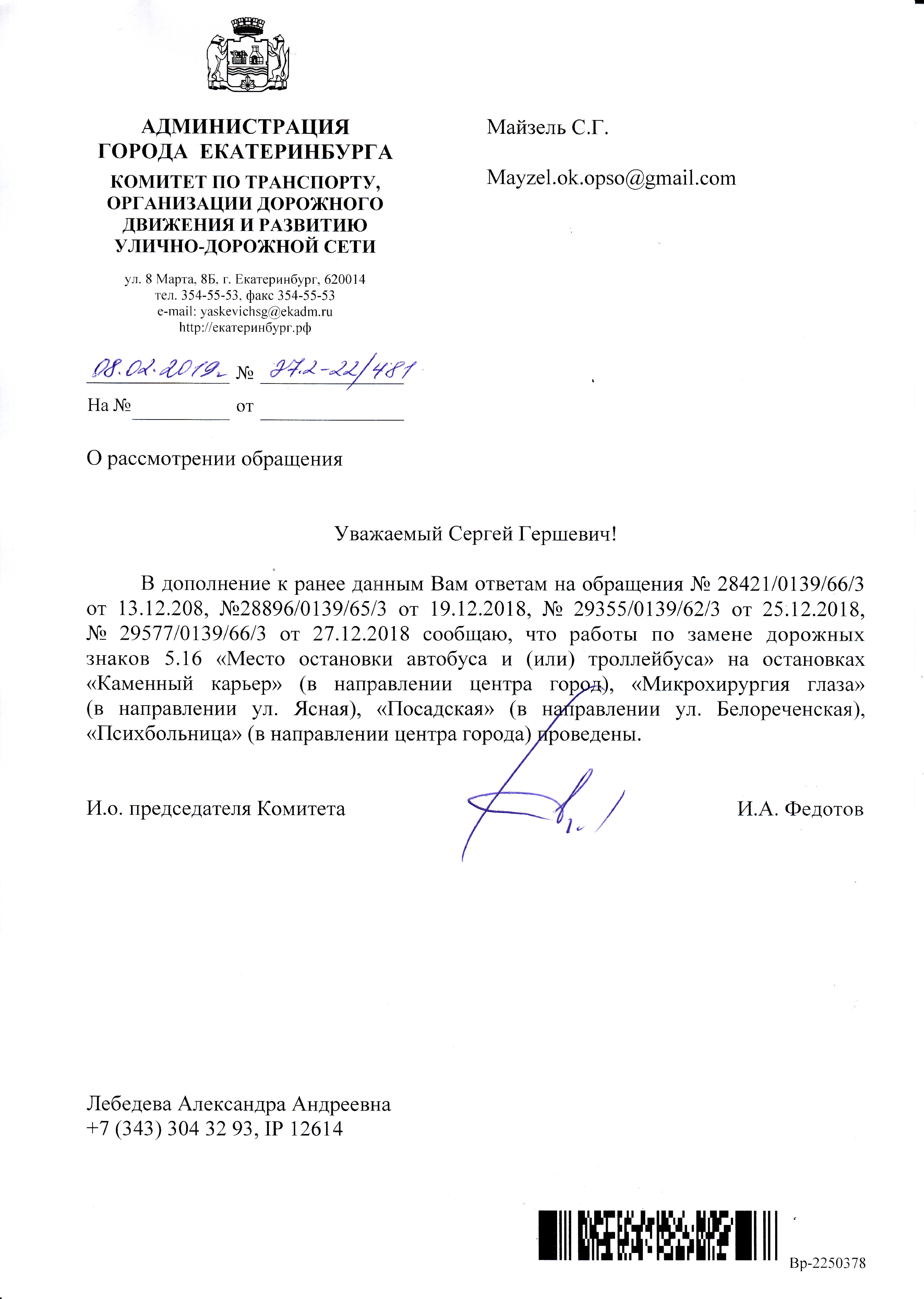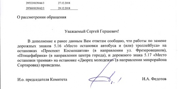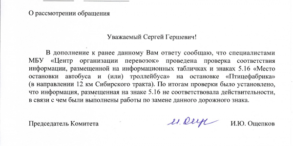 Номер жалобы:47919 Тип жалобы:Прочее Название объекта: Регион:Свердловская область Город:Екатеринбург Адрес:Екатеринбург, Сибирский тракт, 8-й километр Описание жалобы:Не правильный список маршрутов на знаке "Место остановки автобуса" у остановки Психбольница в сторону ост.Станция Путевка. Фактически проезжают маршруты: 1,32,64,047 Статус: