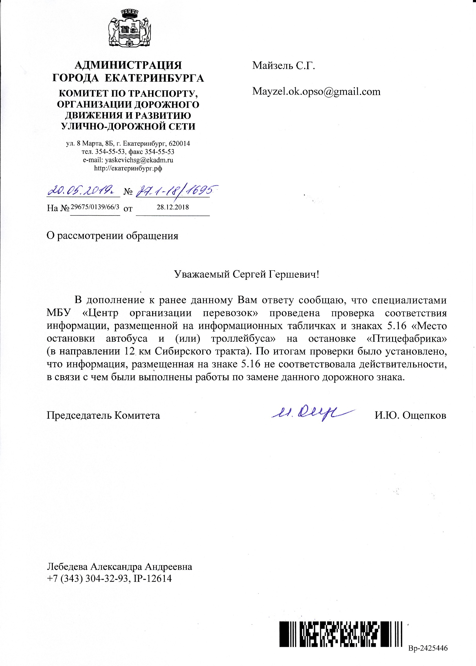 Номер жалобы:47948 Тип жалобы:Прочее Название объекта: Регион:Свердловская область Город:Екатеринбург Адрес:улица Амундсена Описание жалобы:Не правильный список маршрутов на знаке "Место остановки автобуса" у остановки Рабочая в сторону ост. Лесная. На знаке указаны маршруты А23,50м. Фактически проезжают маршруты: А23,50,054,Т14 Статус: