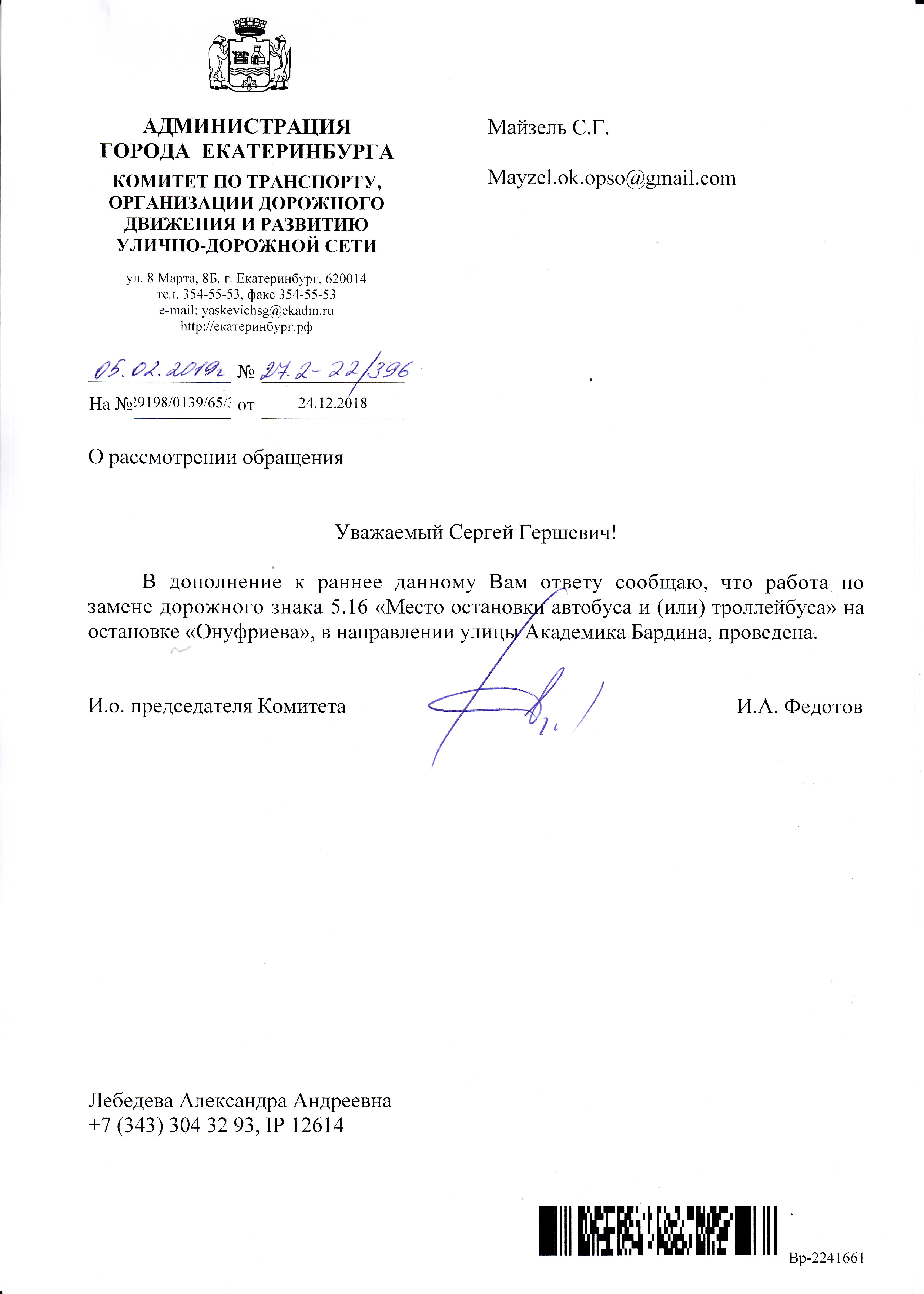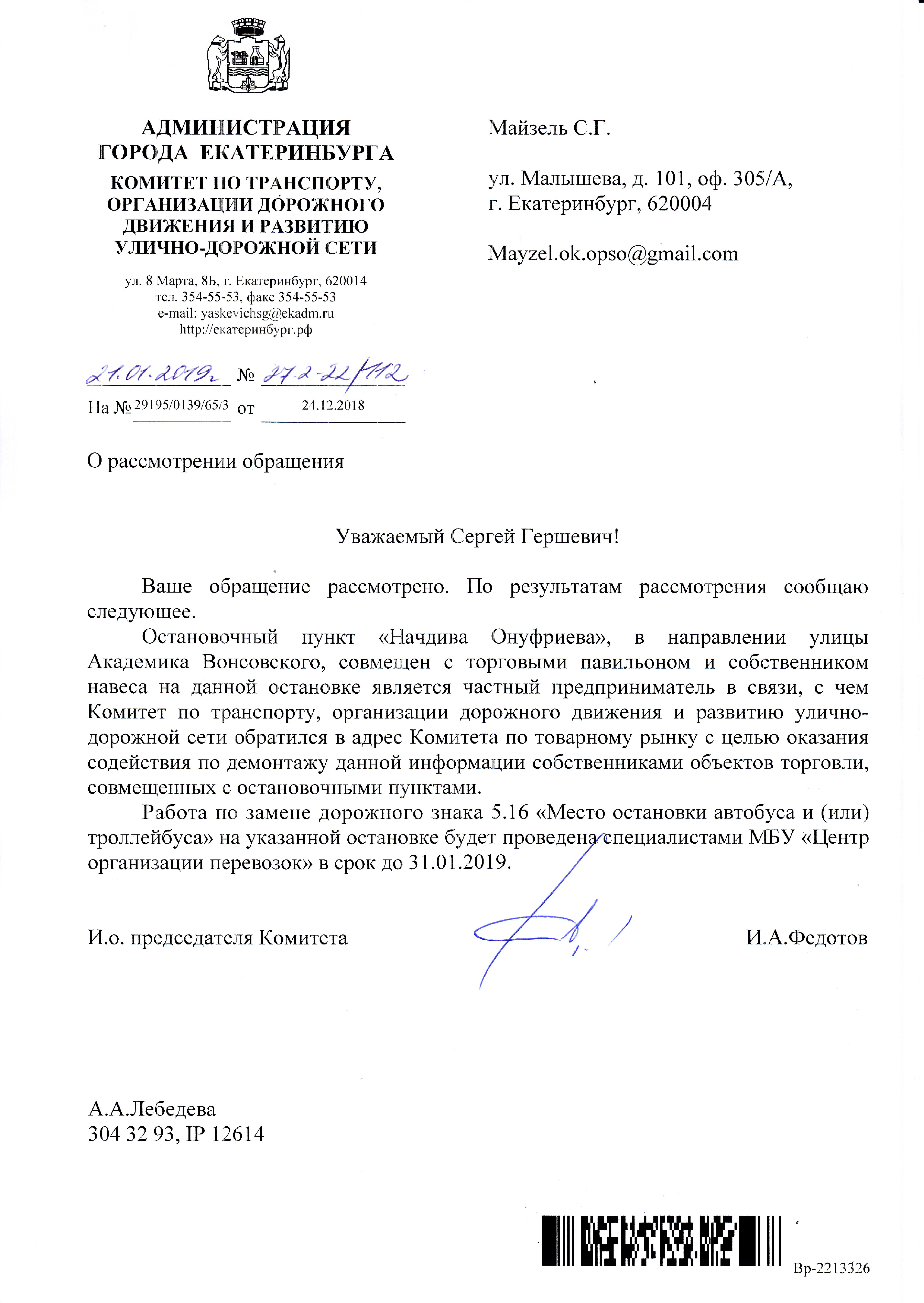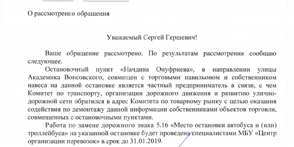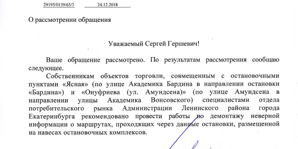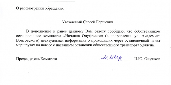 Номер жалобы:47518 Тип жалобы:Прочее Название объекта: Регион:Свердловская область Город:Екатеринбург Адрес:улица Амундсена, 74 Описание жалобы:Не правильный список маршрутов на навесе остановки Начдива Онуфриева в сторону ул.Академика Вонсовского. На знаке указаны маршруты А21,23,43,50,50а.Т14. Фактически проезжают маршруты: А21,23,43,50,014,052,054,070. Т14 Статус: