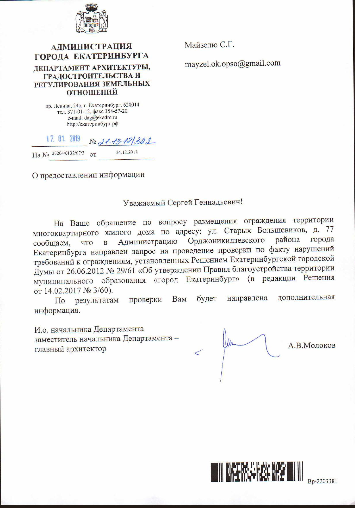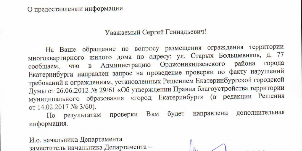 Номер жалобы:47495 Тип жалобы:Прочее Название объекта:Мэрия Регион:Свердловская область Город:Екатеринбург Адрес:улица Старых Большевиков, 77 Описание жалобы:В 2018 году в арке многоквартирного жилого дома 77 по улице Старых Большевиков были выполнены работы по установке ограждения. Согласно п. 143 Правил благоустройства территории муниципального образования «город Екатеринбург», ограждения в границах квартала по всей протяженности обращенных к улице сторон должны иметь единообразный вид, высоту и цветовое решение, гармонирующее с окружающей застройкой. Однако вид и цветовое решение ограждения дома 77 по улице Старых Большевиков, обращённого к улице Фрезеровщиков, не гармонирует с фасадом и отличается от установленного ранее ограждения дома 70 по улице Стачек. Статус: